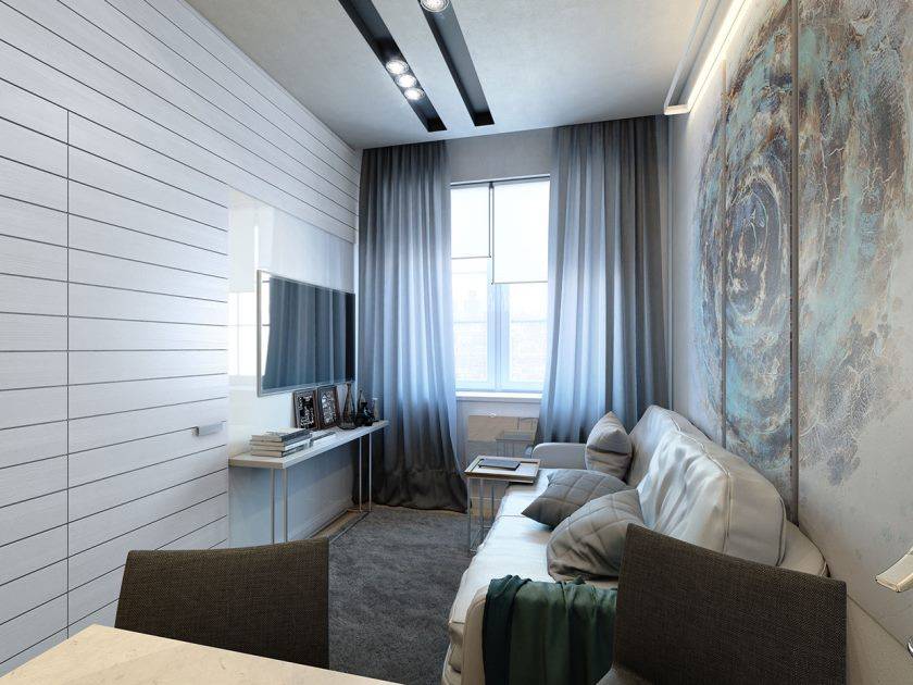 Для небольшой квартиры подойдут четкие линии и нейтральные цвета, помогающие визуально не утяжелять пространство. Комнату желательно оформить в нейтральных тонах – сером, бежевом или кремовом. Шторы можно заменить на светлые полупрозрачные ролл-шторы и жалюзи.
