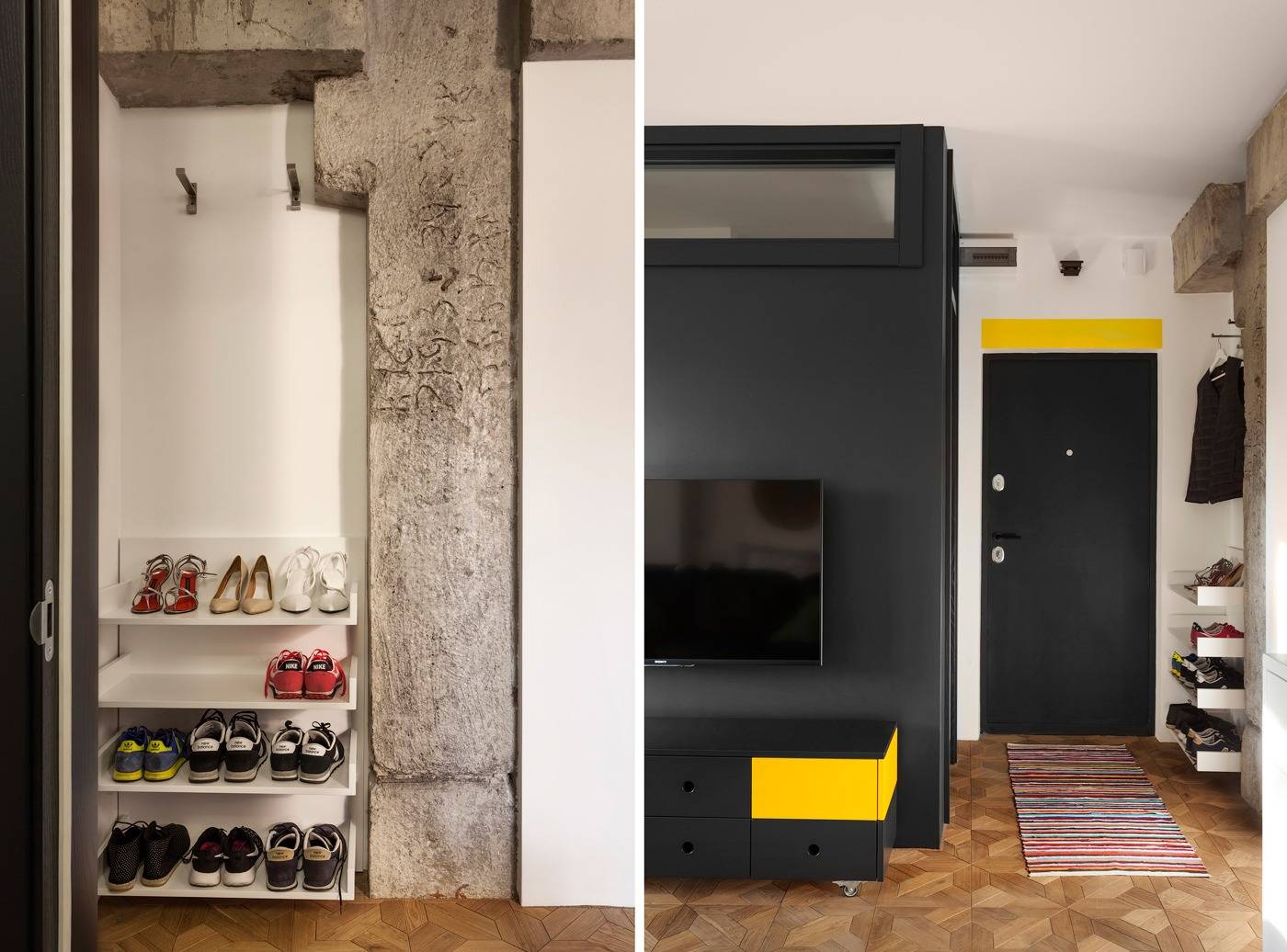 Организовать удобное хранение вещей в маленькой квартире задача не из легких. В данном случае мы видим, как при помощи компактных полок удалось разместить все вещи и освободить пространство вокруг