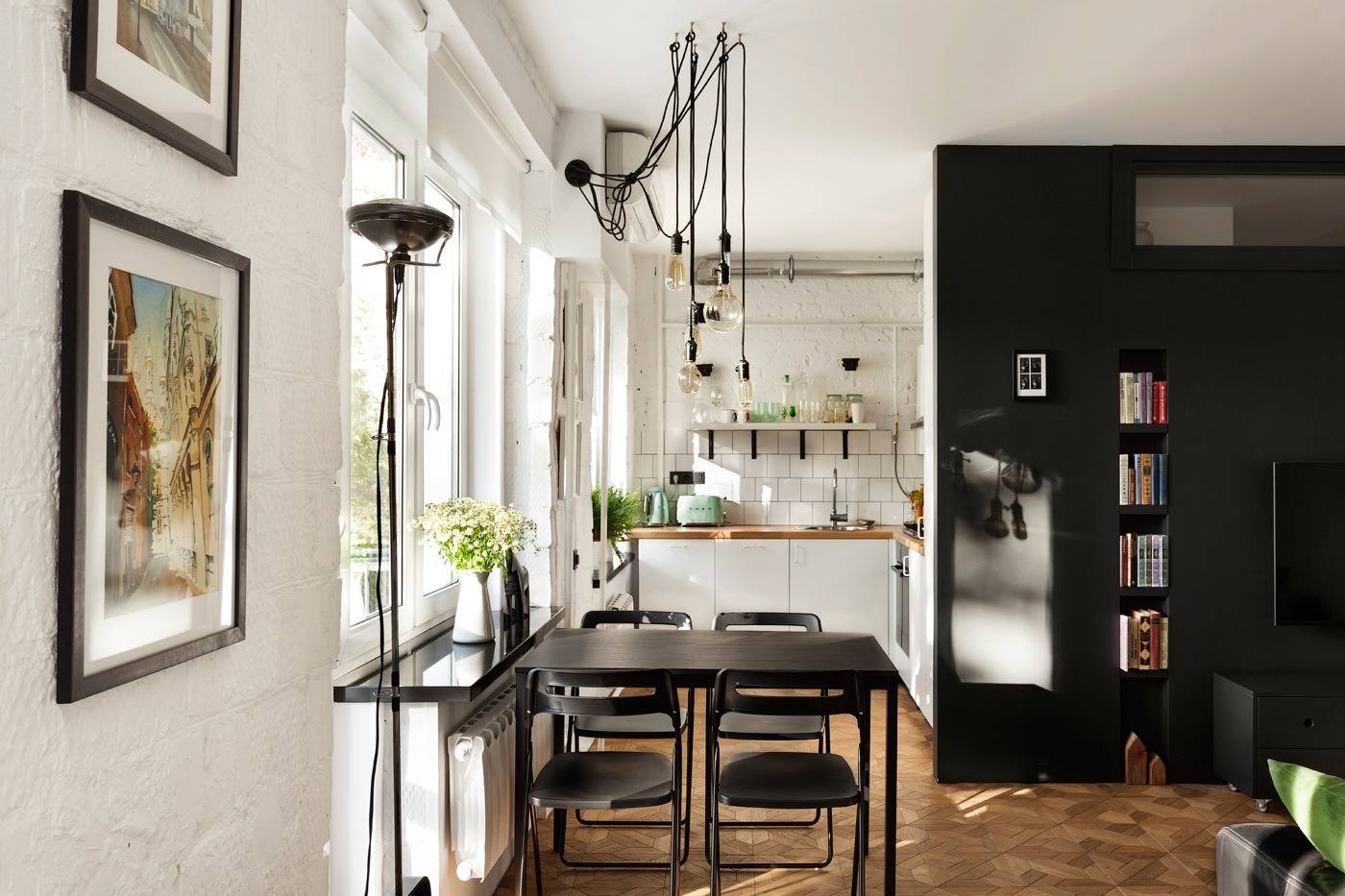 Первое, на что падает взгляд на кухне – великолепные винтажные приборы от Smeg, выполненные в нежной пастельной гамме. Далее мы видим необычный вариант промышленного освещения — ретро-лампочки Эдисона, которые не только ярко освещают пространство, но и сами по себе являются ярким предметом декора.