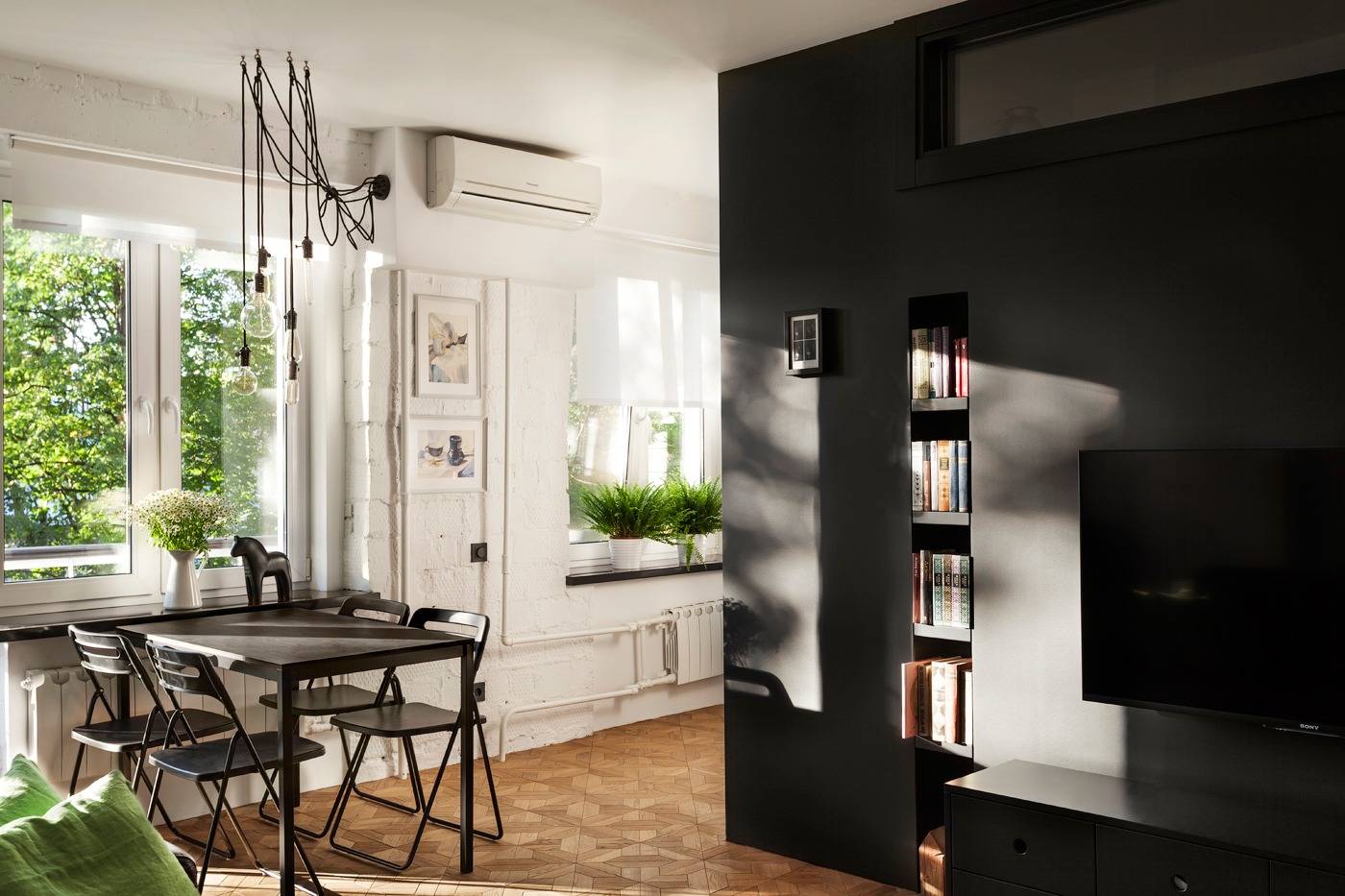 Несложно заметить черную матовую стену по центру квартиры, которая ловко скрывает внутреннюю часть ванной комнаты. Окно, расположенное сверху, пропускает естественный свет в ванную и одновременно выполняет декоративную функцию: монохромный дизайн квартиры разбавлен яркими всплесками желтого и зеленого.
