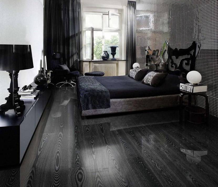 Темные стены в интерьере выглядят контрастно, подчеркивают светлый пол и дополняют друг друга.