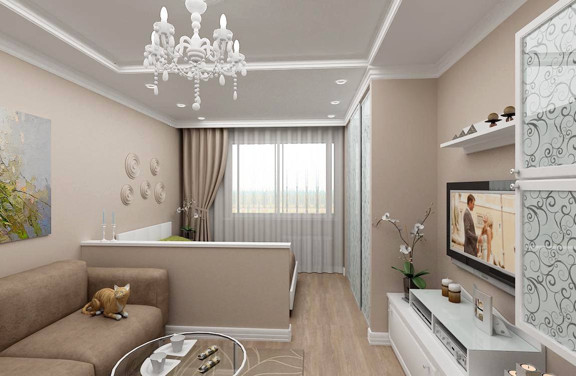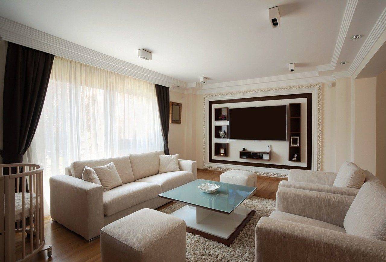 - Для маленькой гостиной в квартирах, типа хрущевка, подойдут одноуровневые конструкции или многоуровневые модели с частичным расположением по потолочной поверхности.