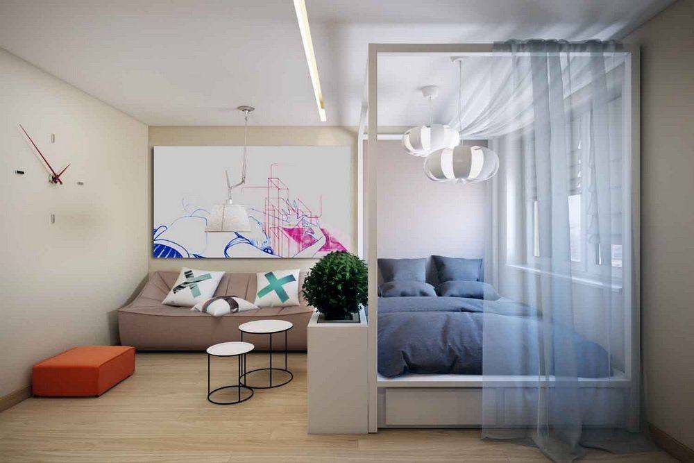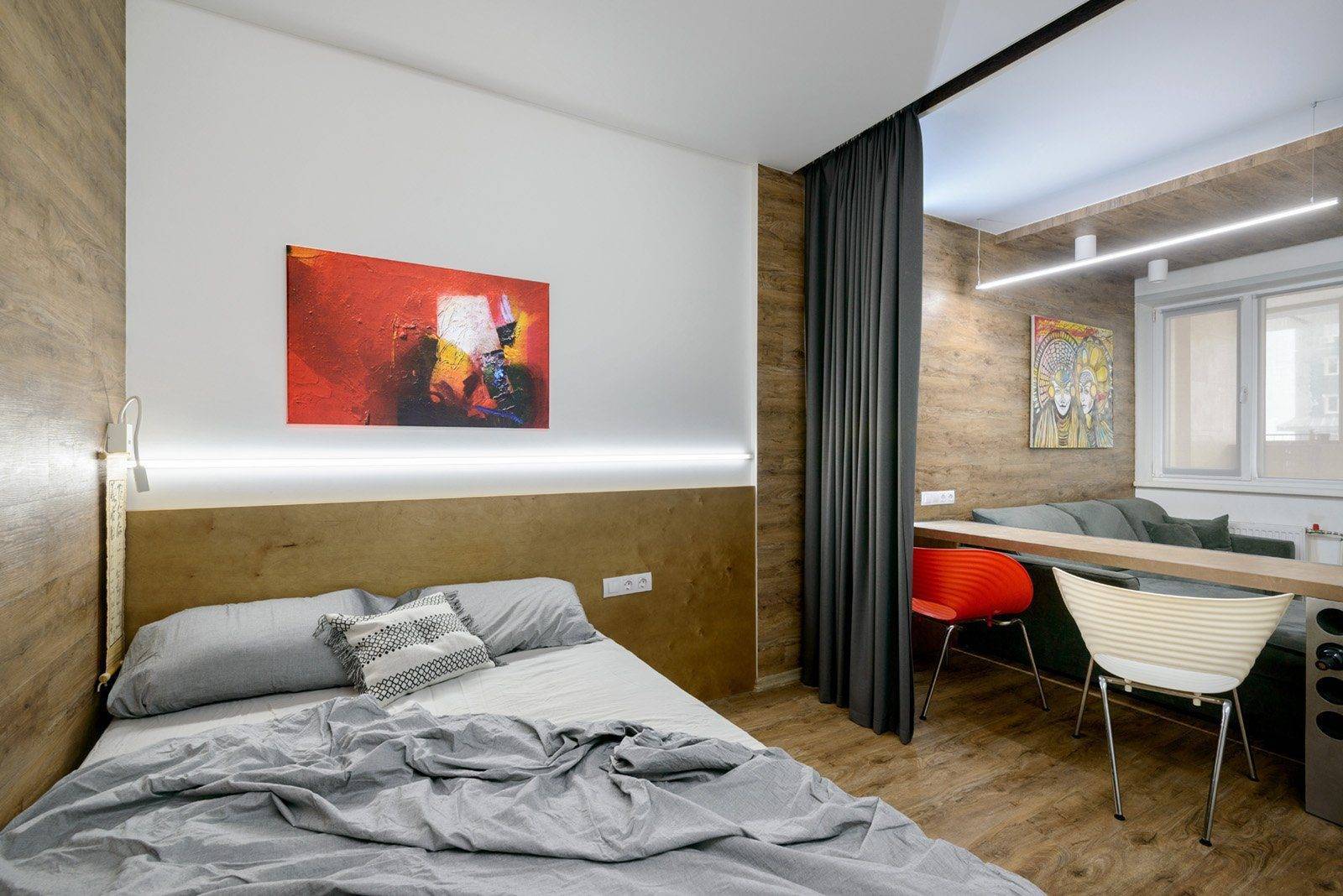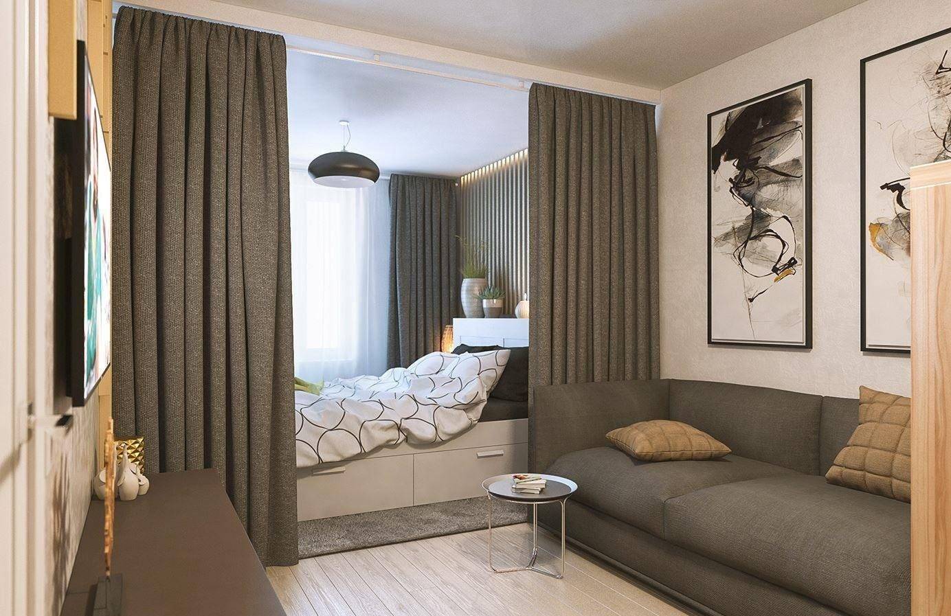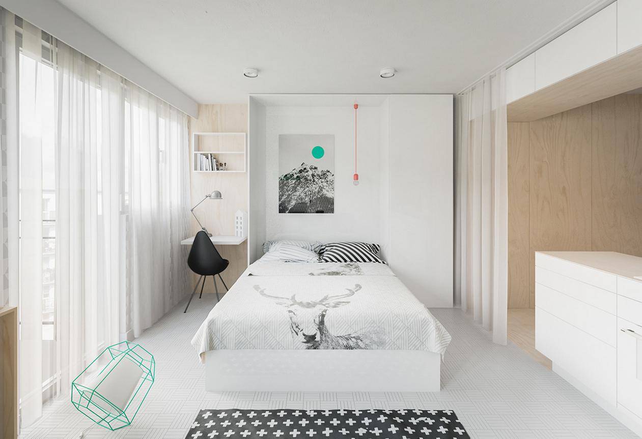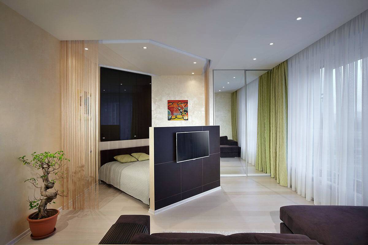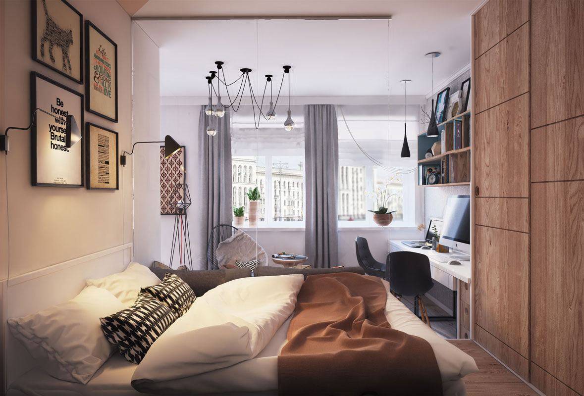 Как видите, даже в маленькой однокомнатной квартире вы можете создать пространство для уютной спальни. Все, что вам нужно сделать, это сохранить символическое разделение на зоны, и эффект будет удовлетворительным. Получите спокойное место для отдыха, а с другой стороны ваша квартира не будет разделена на несколько небольших комнат. Более того, преимущество этой договоренности заключается в том, что вы можем легко изменить интерьер в любое время.