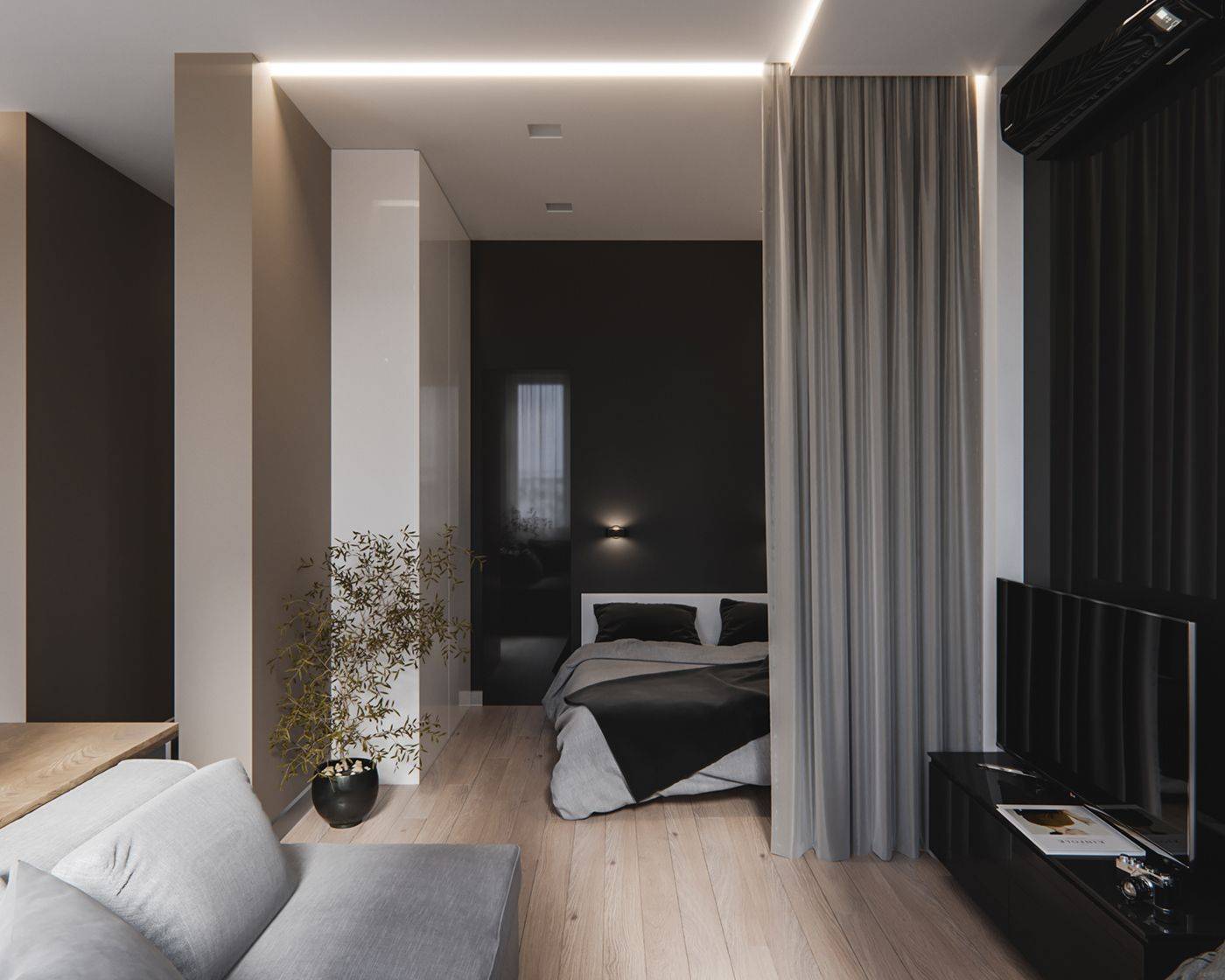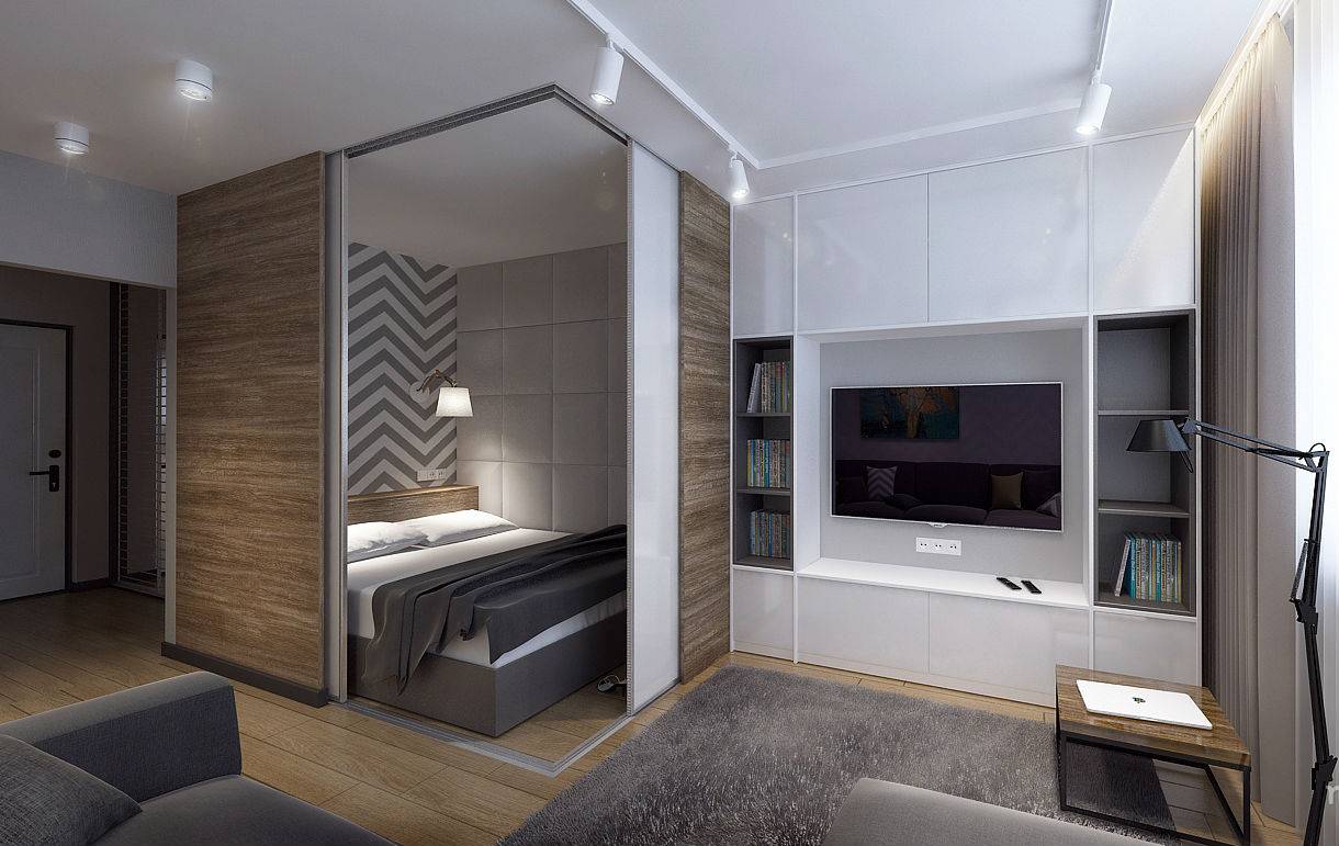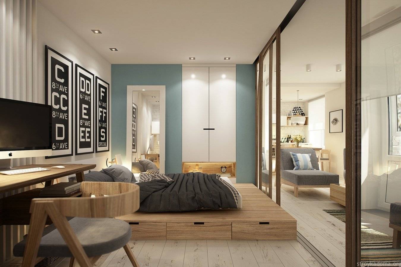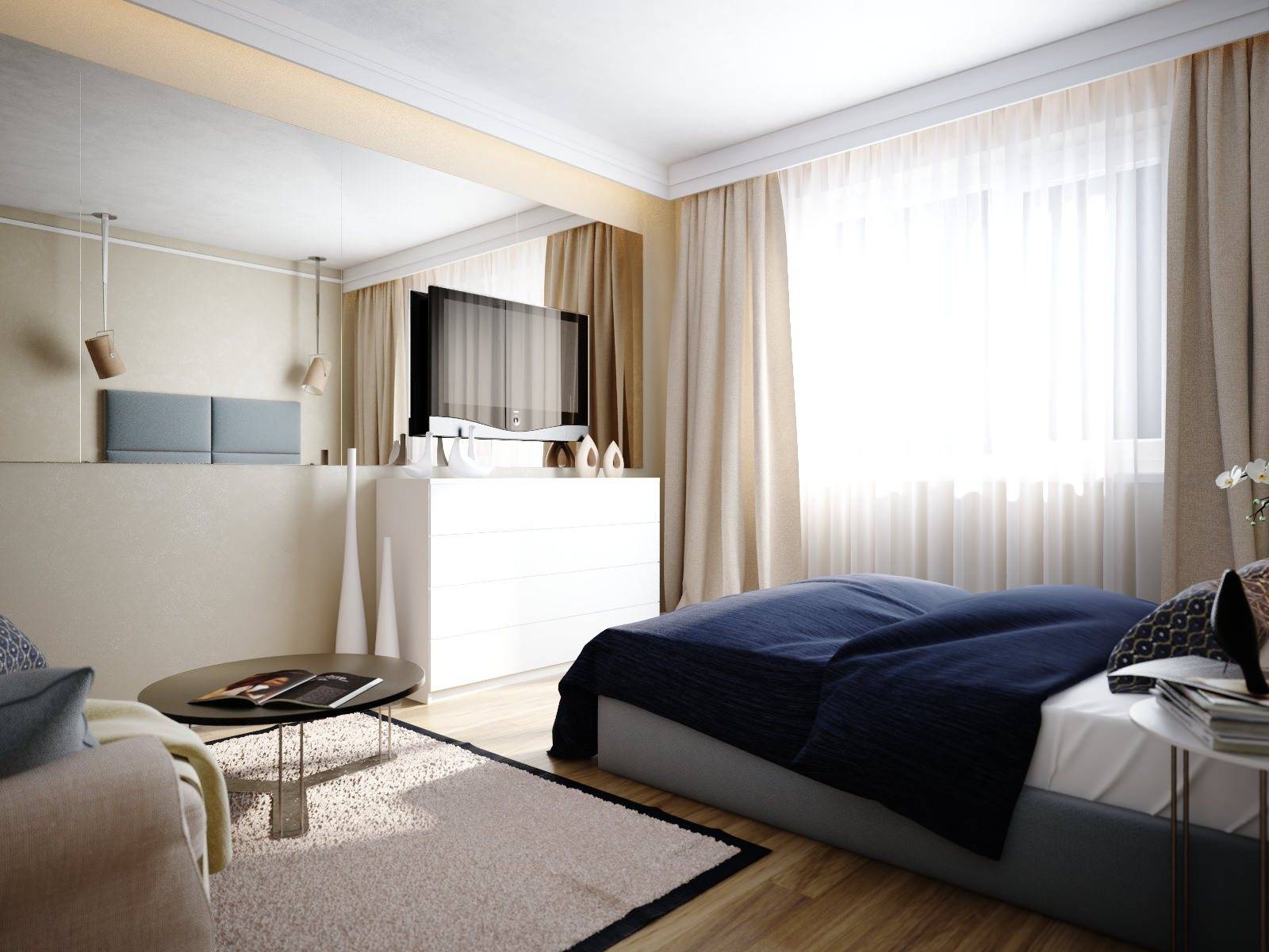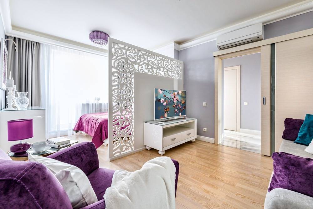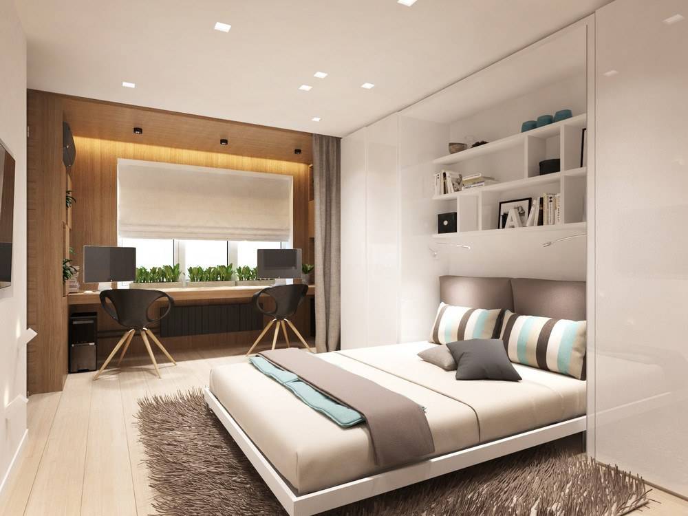 Как видите, даже в маленькой однокомнатной квартире вы можете создать пространство для уютной спальни. Все, что вам нужно сделать, это сохранить символическое разделение на зоны, и эффект будет удовлетворительным. Получите спокойное место для отдыха, а с другой стороны ваша квартира не будет разделена на несколько небольших комнат. Более того, преимущество этой договоренности заключается в том, что вы можем легко изменить интерьер в любое время.