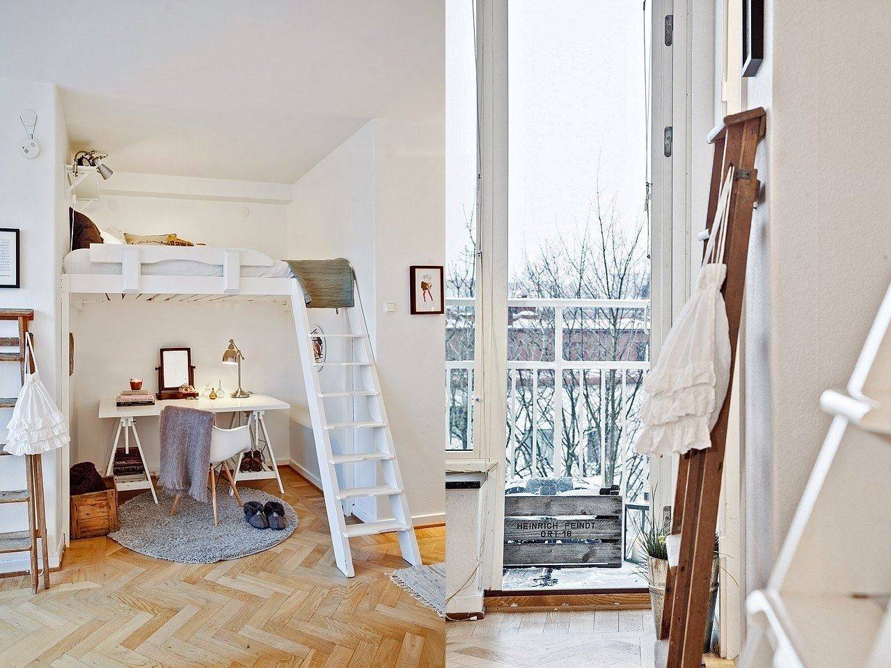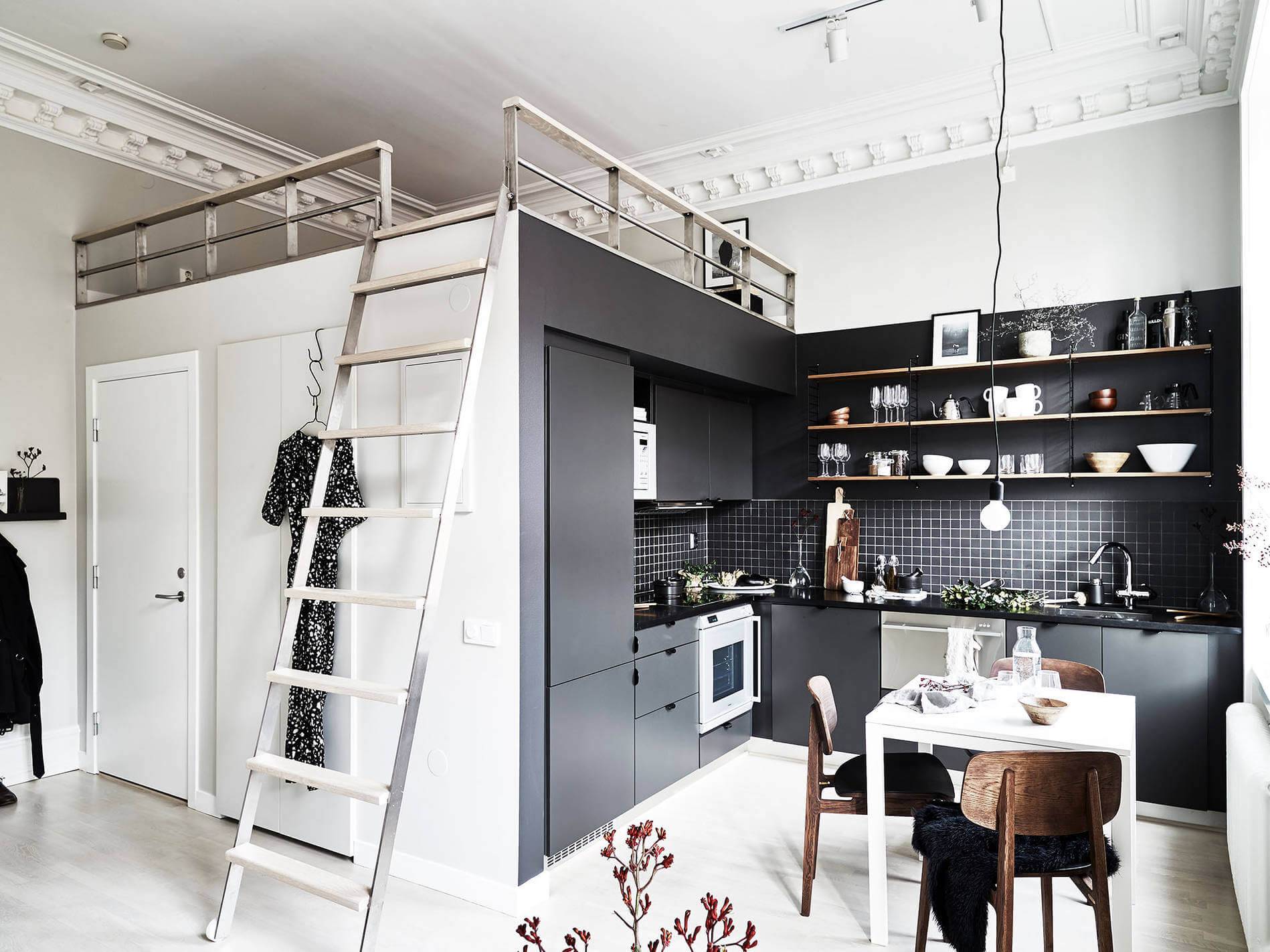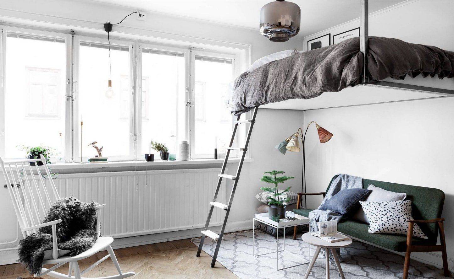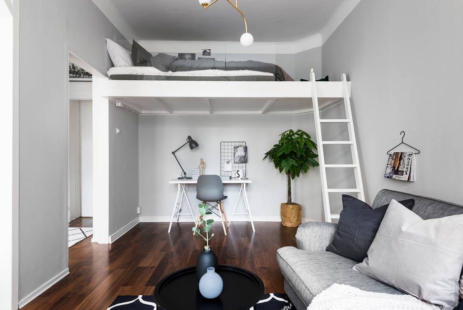 В случае квартир с высокими потолками стоит рассмотреть мезонин. Это идеальное решение, как использовать доступ к потолку, и, таким образом, сохранить полезное пространство студии. Для этой цели вы можете выбрать двухъярусную кровать, верхней частью которой будет ваша спальня, а пространство под ней можно расположить любым способом. Другой способ — построить мезонин и поставить отдельную кровать на временный пол или просто матрас, если комната недостаточно высока. В этом случае, однако, вы должны помнить о правильной балюстраде, которая защитит вас от падения с высоты.
