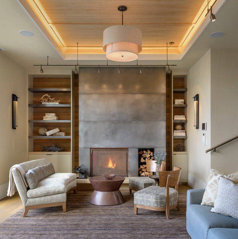 Эта комната обычно самая большая в доме, и здесь самое подходящее место для объемных потолков, необычного декора и разнопланового освещения. В гостиной нередко используется прием оформления различных зон фигурными элементами. Чаще всего выделяют пространство камина, телевизора, большого дивана, обеденного стола. Если вы планируете устроить многоуровневый потолок в небольшой гостиной, от большой сложной люстры стоит отказаться в пользу аккуратного плафона.