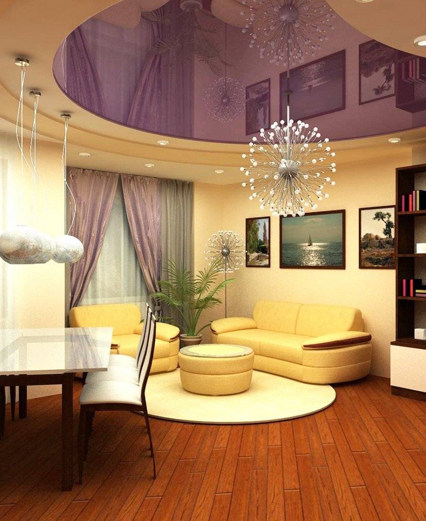 Комбинированные варианты: достаточно просто ввести в конструкцию из гипсокартона натяжную конструкцию. Глянцевые потолки имеют свойство звукоизоляции и визуально расширяют пространство. Кроме того этот материал экологически чистый и безопасный для здоровья.