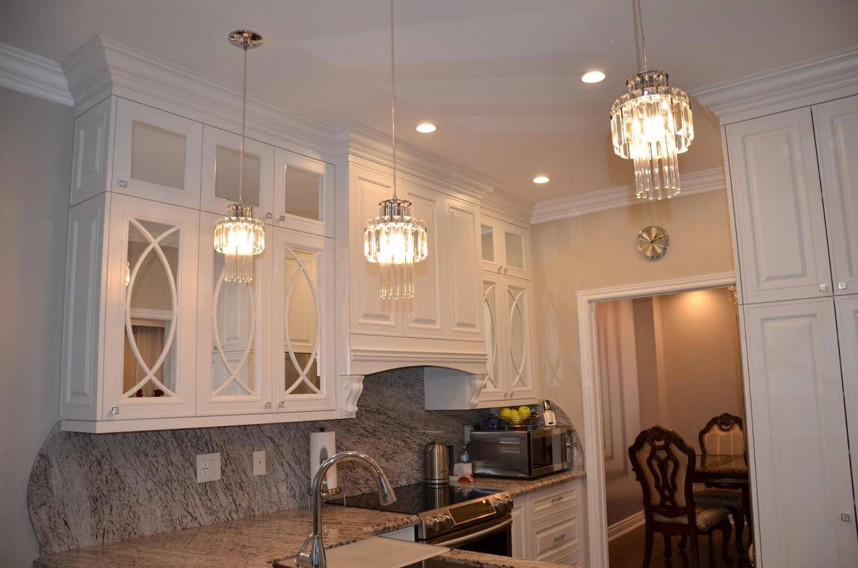 Если кухня островная, то отдельный уровень часто выносится непосредственно над ней. Это не только красиво, но и позволяет решить задачу с ее подсветкой. Ведь светильники можно элегантно разместить непосредственно на нем.