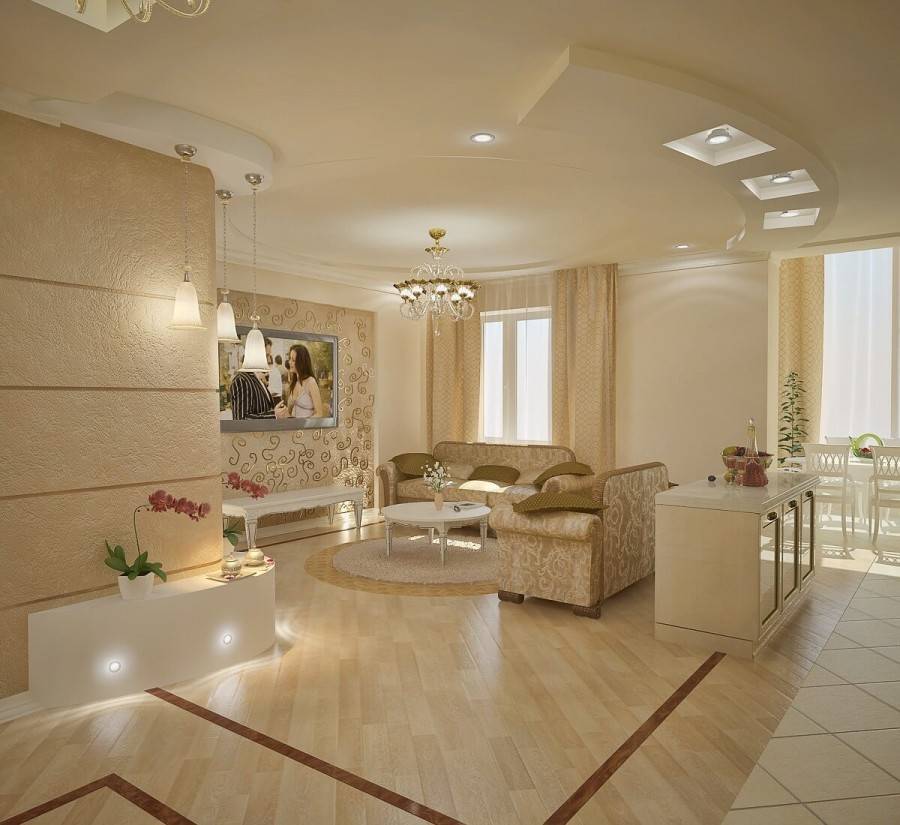 Если у вас большое помещение, то вам необходимо точечное освещение по периметру комнаты и наличие осветительного прибора в центре комнаты. В случае если ваша гостиная разделена на несколько зон, центральное освещение нужно установить отдельно в каждую зону. Для гостиной небольших размеров достаточно одного вида освещения. Смотрите фото всех вариантов дизайна.