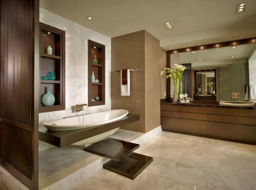 Если комната более 9 метров, ванну можно расположить в самом центре, возможно на возвышении. По периметру на безопасном расстоянии от брызг воды расставить мебель, пропитанную водоотталкивающим составом и вскрытую лаком, непромокаемое кресло, остальную сантехнику и предметы декора.