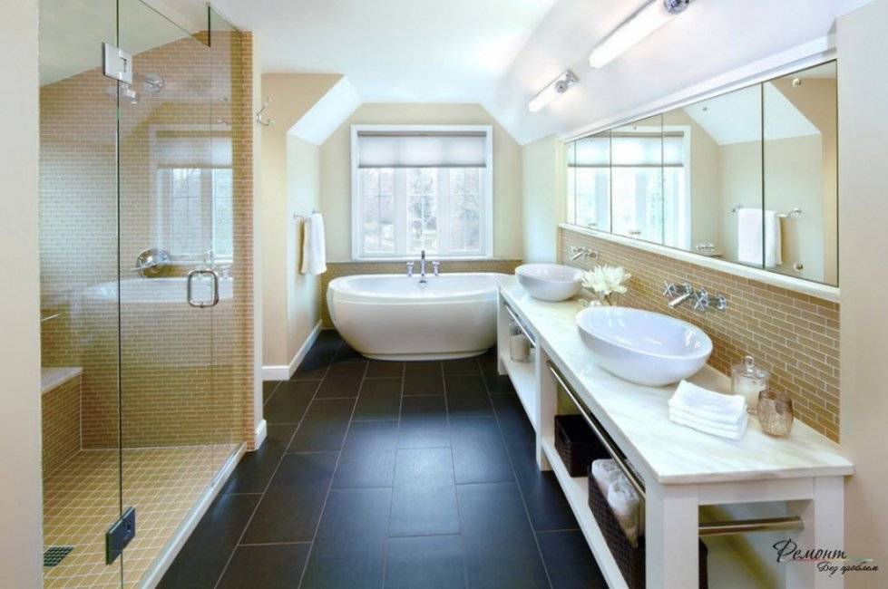 При обустройстве интерьера ванной комнаты, совмещенной с туалетом, все самое необходимое можно разместить на 3,3 квадратных метров площади. Чтобы дополнительно вместить кабинку, ванну, биде, шкафы для полотенец, стиральную машину и полки для бытовой химии надо большое пространство. Обычно такой совмещенный санузел с ванной делают вблизи от главной спальни. Он занимает не менее 8 квадратных метров свободной площади.