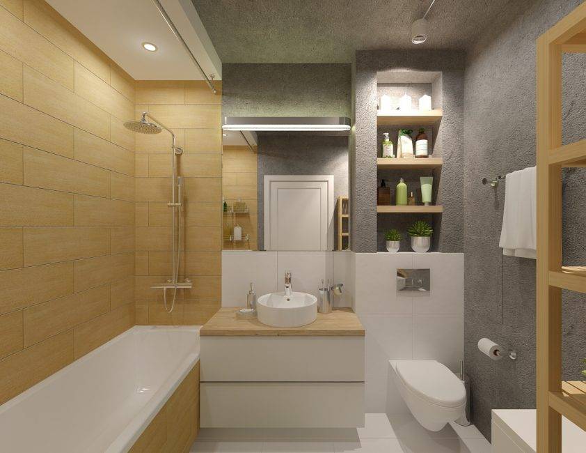 Полноценный дизайн состоит из аксессуаров, банных принадлежностей, которые размещают в соответствии с «правилами вытянутой руки».