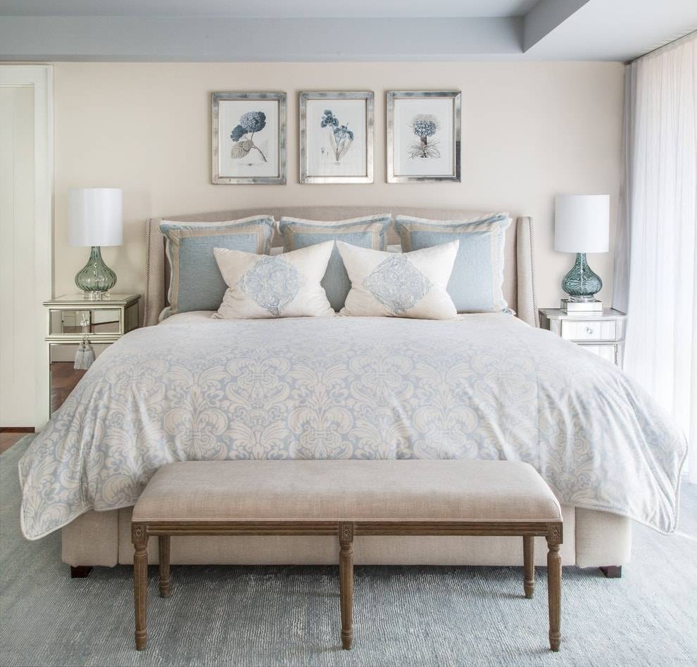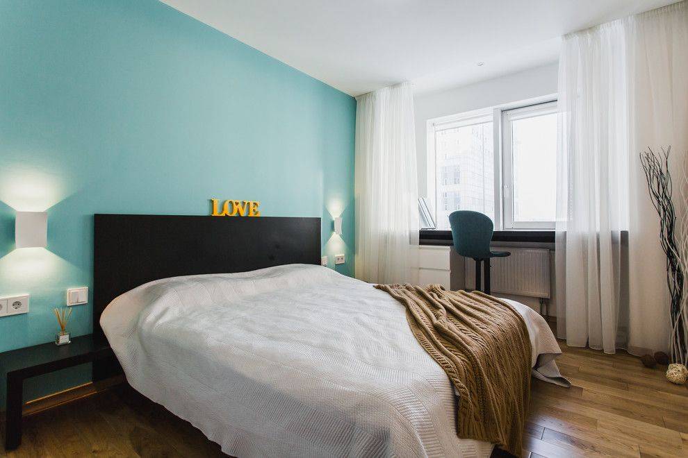 Выбор цвета зависит от вкусов хозяев. Учитывается расположение спальни. Если окна выходят на юг, подойдут холодные тона – голубой, бирюзовый, мятный, изумрудный. Они создадут ощущение простора, добавят дизайну свежести. Для плохо освещенной комнаты подойдут теплые оттенки – бежевый, молочный, персиковый, кремовый, фисташковый. Они добавят дизайну мягкости и легкости.