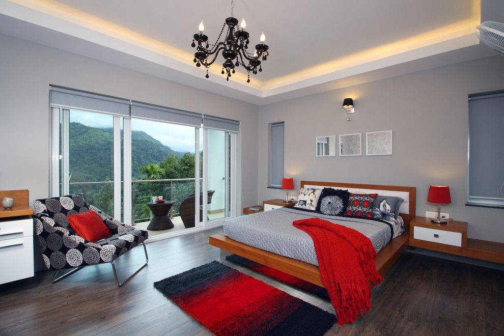 Спальня 14 кв.м. с красными шторами