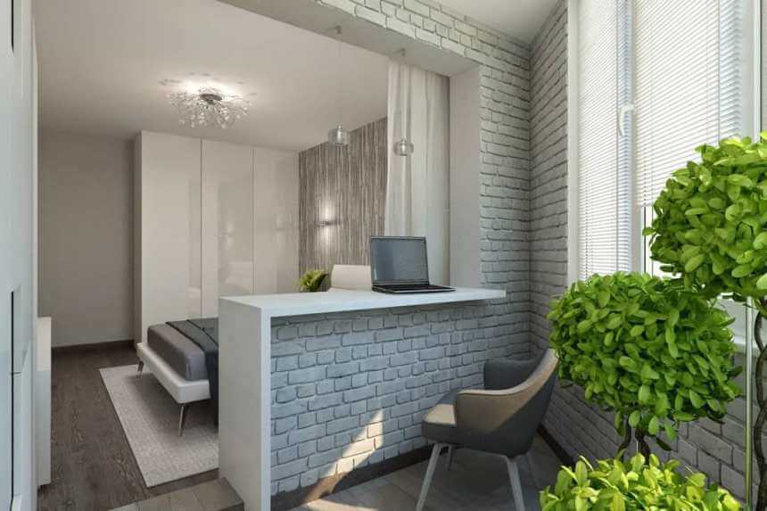 Балкон или лоджию можно использовать для увеличения площади спальни. На дополнительном пространстве оформляют уголок отдыха с небольшим диваном и журнальным столиком или обустраивают рабочий кабинет.