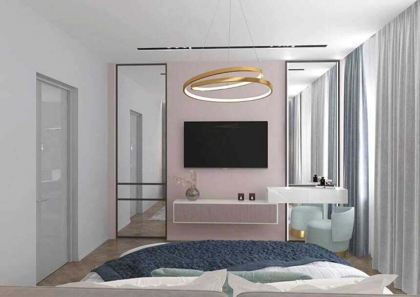 Дизайн спальни 15 кв. м в современном стиле с гардеробной