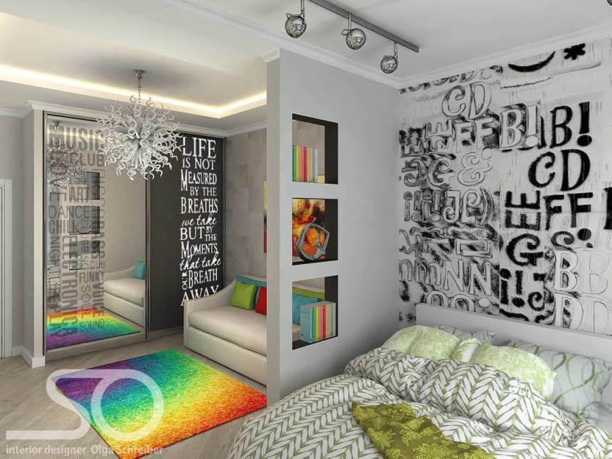 17 кв. м – это не так уж мало для расположения на них минимум двух функциональных зон. При зонировании комнаты 17 кв. м уместно использовать такие приёмы, как: