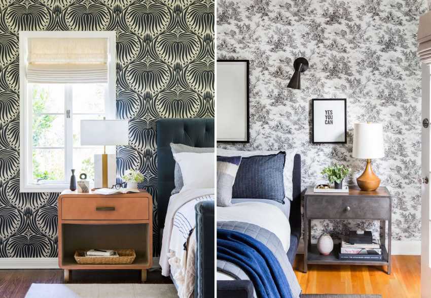 Также на пике популярности «акцентная стена». Традиционно эта стена находится у изголовья кровати. К примеру: акцентную стену заклеиваете яркими обоями, а оставшиеся три однотонными, которые сочетаются по цвету.