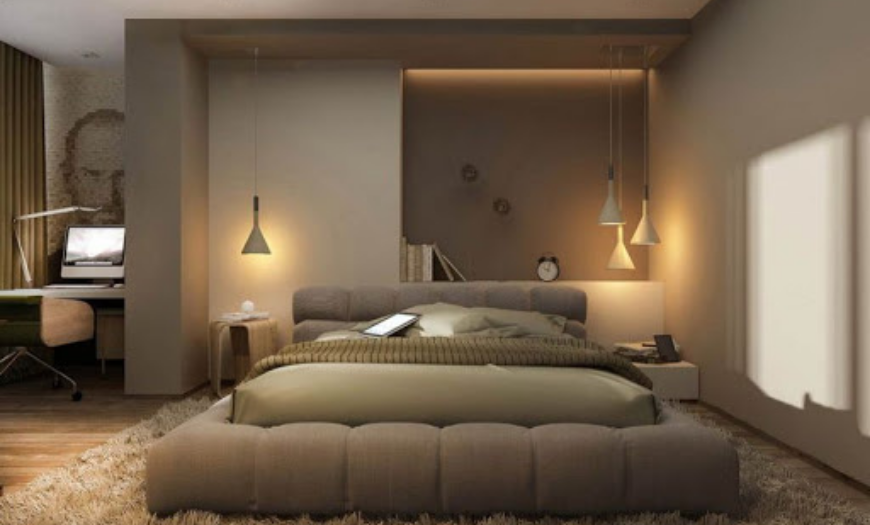 Разграничить кабинет и спальню можно с помощью оттенков цвета, фактурных материалов, мебели. Уместным будет книжный стеллаж, который хорошо дополнит рабочую зону. Письменный стол поставьте у окна — там больше света. При нехватке пространства его можно поставить возле кровати или вместо прикроватной тумбы.