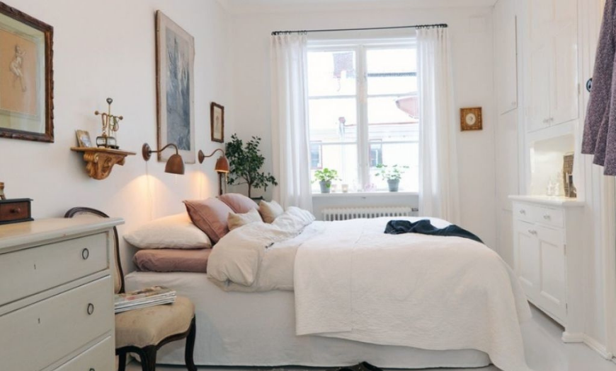 По возможности лучше размещать в спальне как можно меньше мебели. Если отказаться от каких-либо предметов интерьера не получается, можно заменить их более миниатюрными аналогами, например, вместо прикроватного столика поставить маленький комод.
