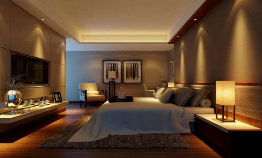 Ночники и декоративная подсветка не только станут украшением спальни, но и помогут передвигаться по ней в темное время суток. Подсветка может быть встроена в зеркала, панно или многоуровневый потолок.