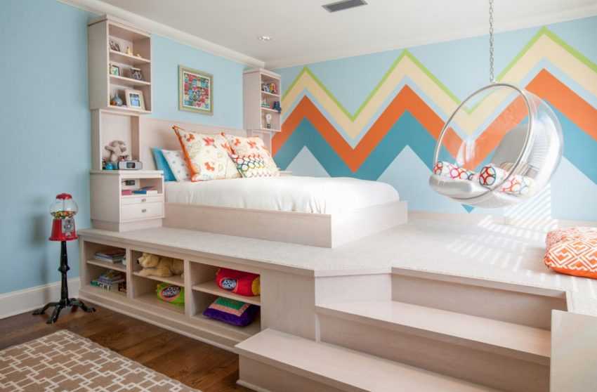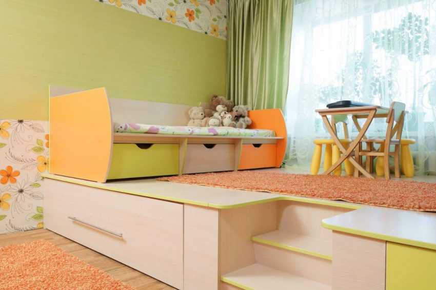 Возведение небольшого подиума в детской спальне может сразу же решить вопрос с нехваткой свободной площади. Сам подиум изготавливают под заказ или своими руками из древесины. Внутреннее пространство под площадкой обустраивают в виде полок, выдвижных ящиков, секретеров, которые выполняют роль полноценных зон хранения. В этих же нишах можно хранить пледы, подушки, постельное бельё, игрушки.