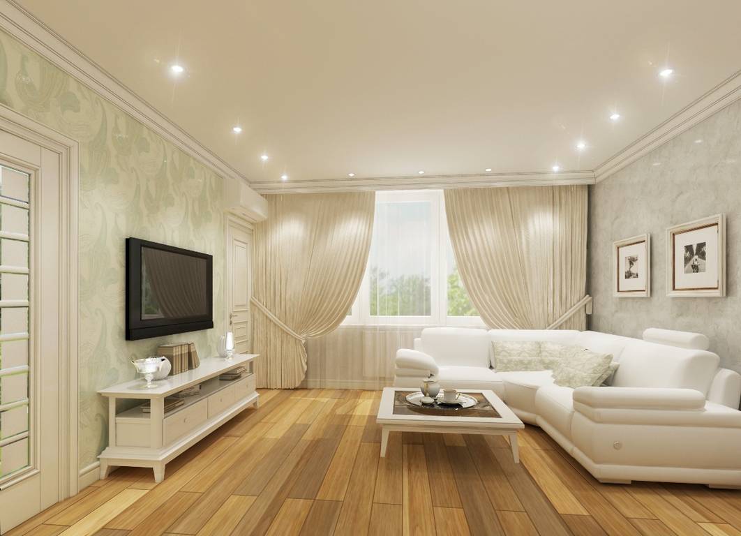 Следующий пример показывает, как можно обустроить квартиру в классическом стиле. Если использовать очень светлую цветовую гамму, белую мебель и легкие прозрачные занавески на окнах, то вполне можно использовать характерные классические элементы, такие как лепнина, драпировка, рюши и резьба по дереву.