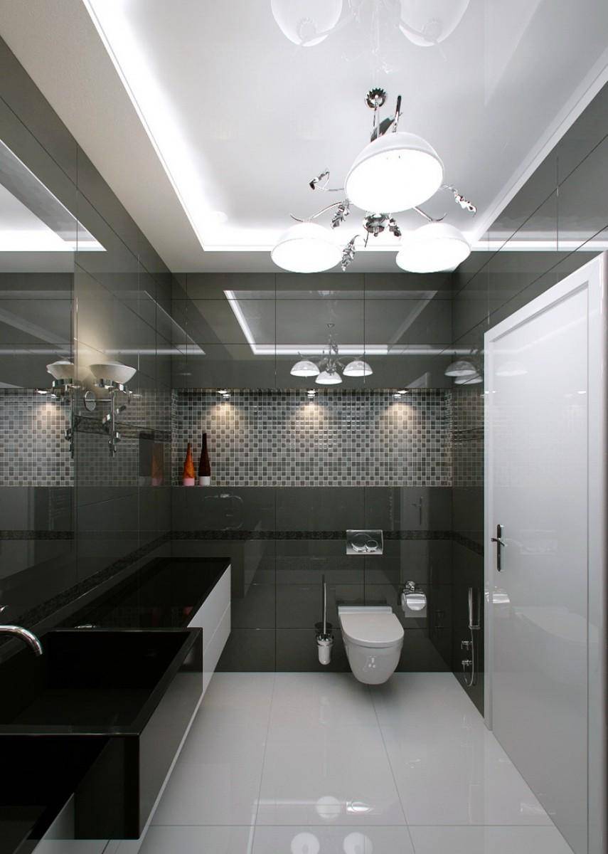 Для маленького туалета самым удачным вариантом отделки станет натяжной потолок. Он имеет ряд разновидностей – жемчужный, матовый, шелковый, глянцевый. Общий дизайн туалета с высококачественным потолком можно будет по достоинству оценить только в сочетании с отличным освещением, основным и дополнительным.