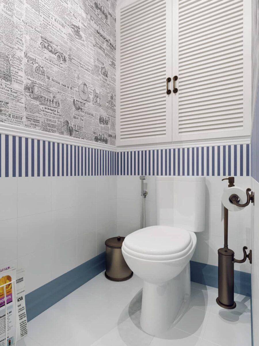 Интересным вариантом считается использование туалетных обоев с уходящими узорами вниз или вверх. Таким образом придается эффект бесконечности, который так необходим для маленькой комнаты. Обои можно выбирать любого типа, но цвета также должны максимально сочетаться и не вызывать нарекания у глаз.