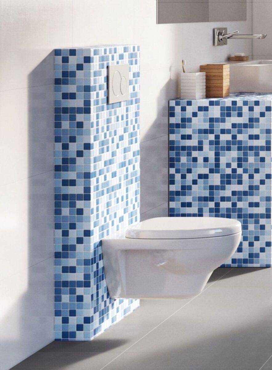 Подвесной унитаз инсталлирован в углу. Плавность перехода отделки стен обеспечивается плиткой-мозаикой.