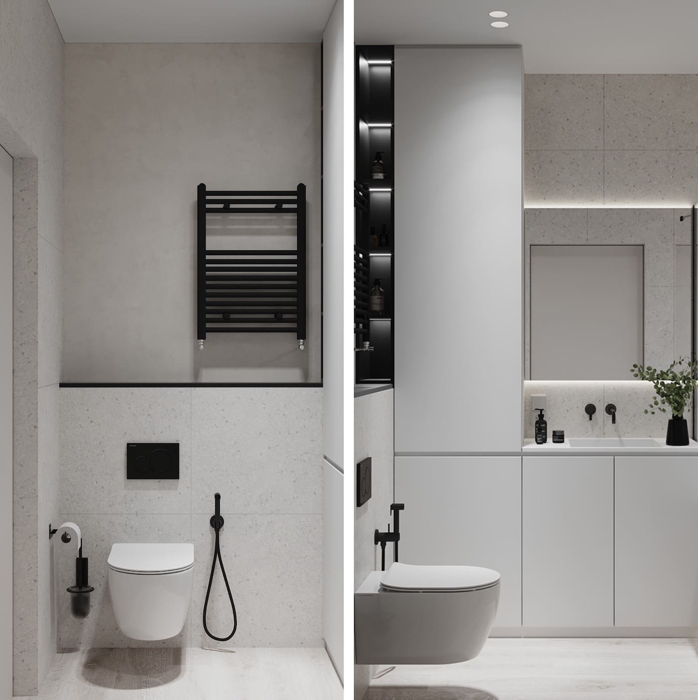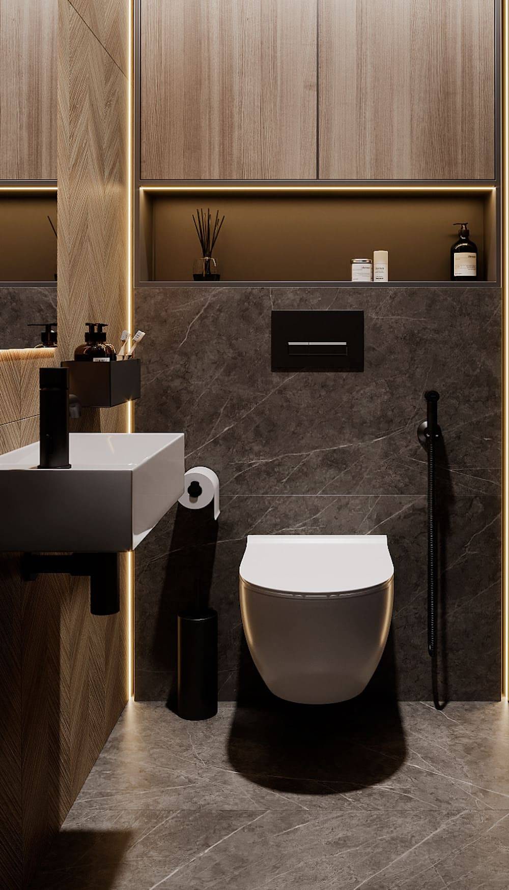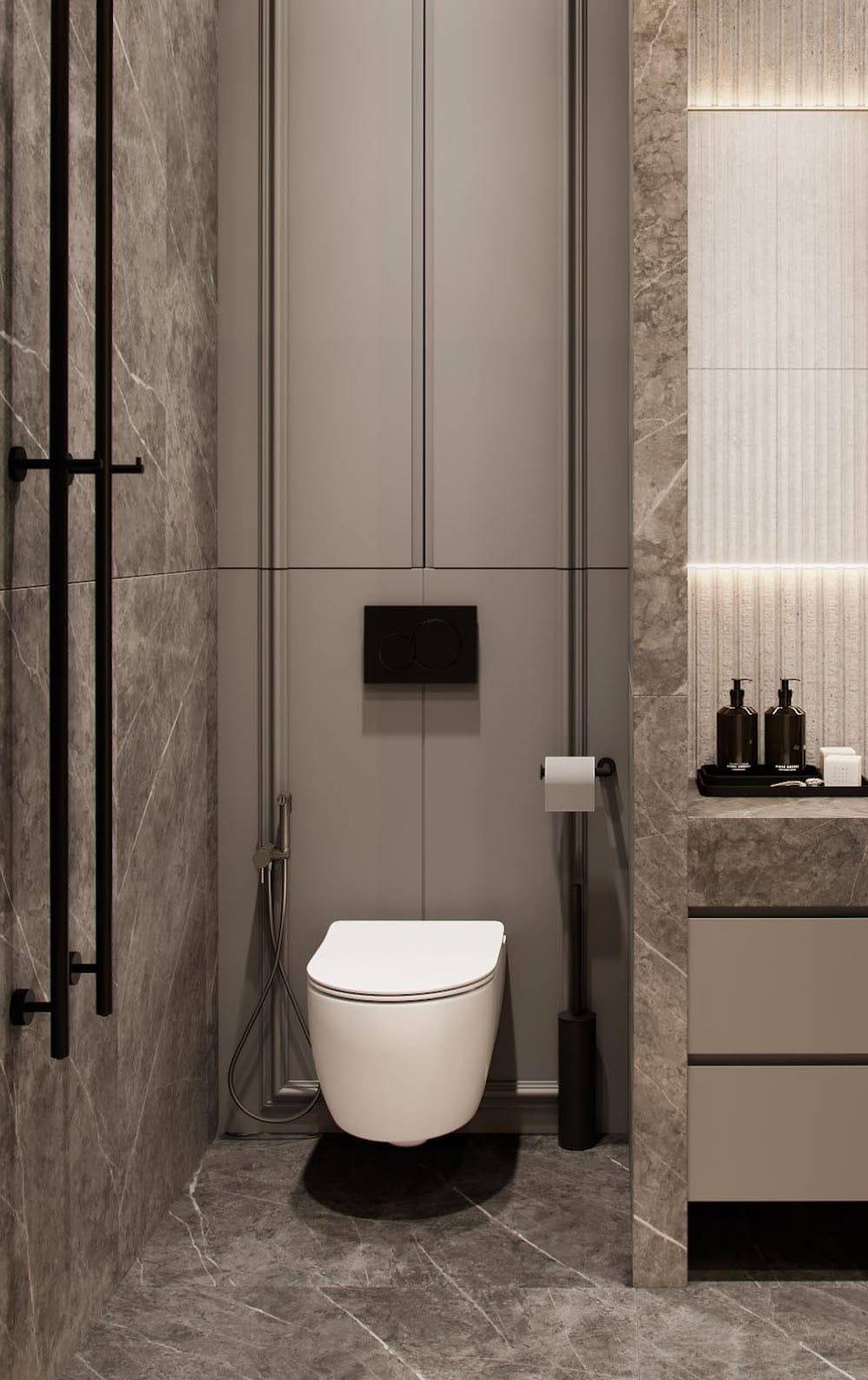 Пандемия диктует свои правила: люди стали больше времени проводить дома. Поэтому в современном дизайне туалетной комнаты лучше исключить яркие или раздражающие тона и детали. Модный дизайн в туалете – это нейтральная палитра, которая воспринимаются естественно, а также сочетание не более двух оттенков цвета.