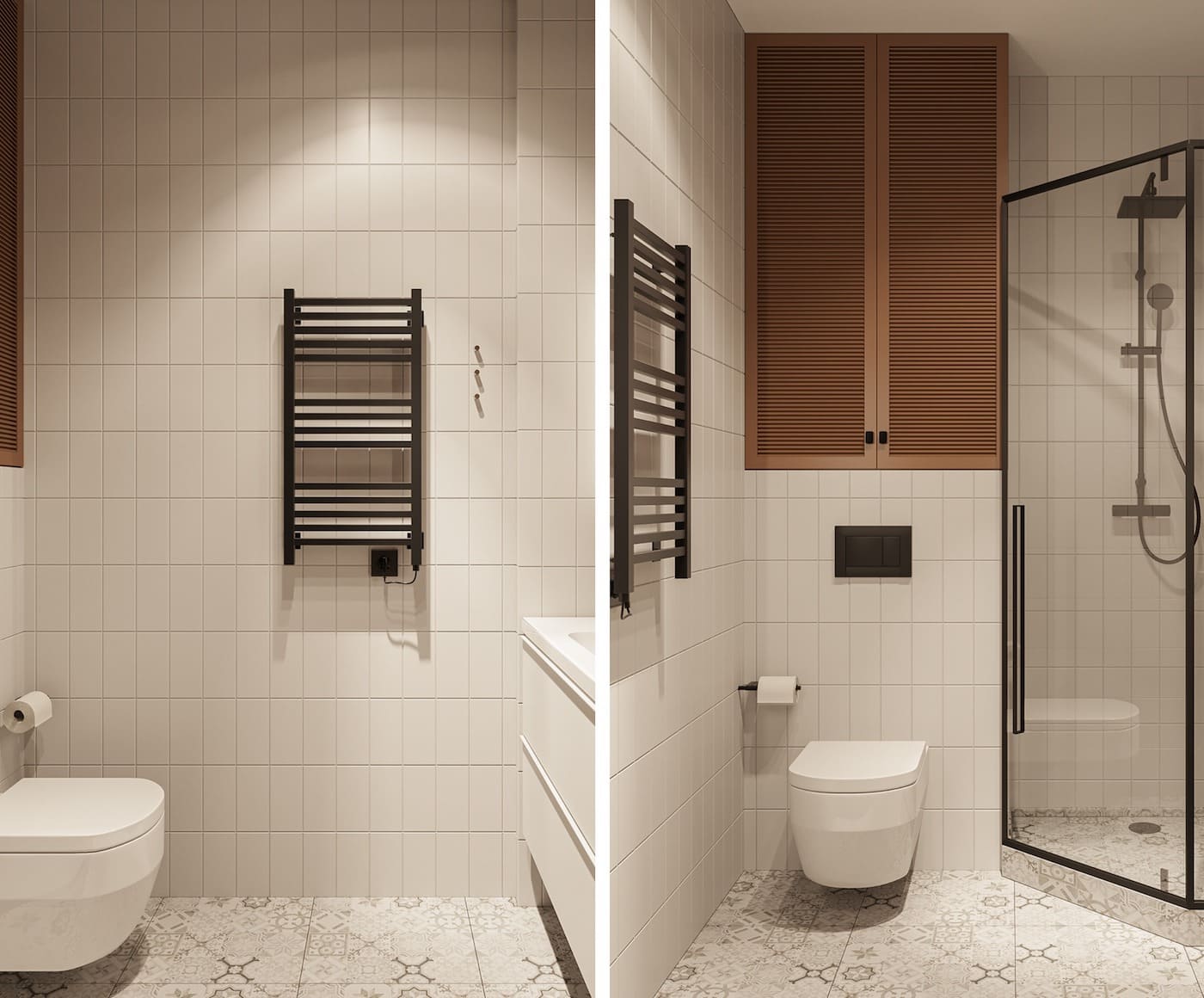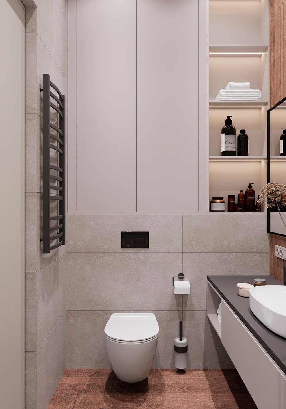 На фото отделка стен и пола плиткой большого размера, шкаф встроен в стену и не выступает над унитазом для экономии пространства.