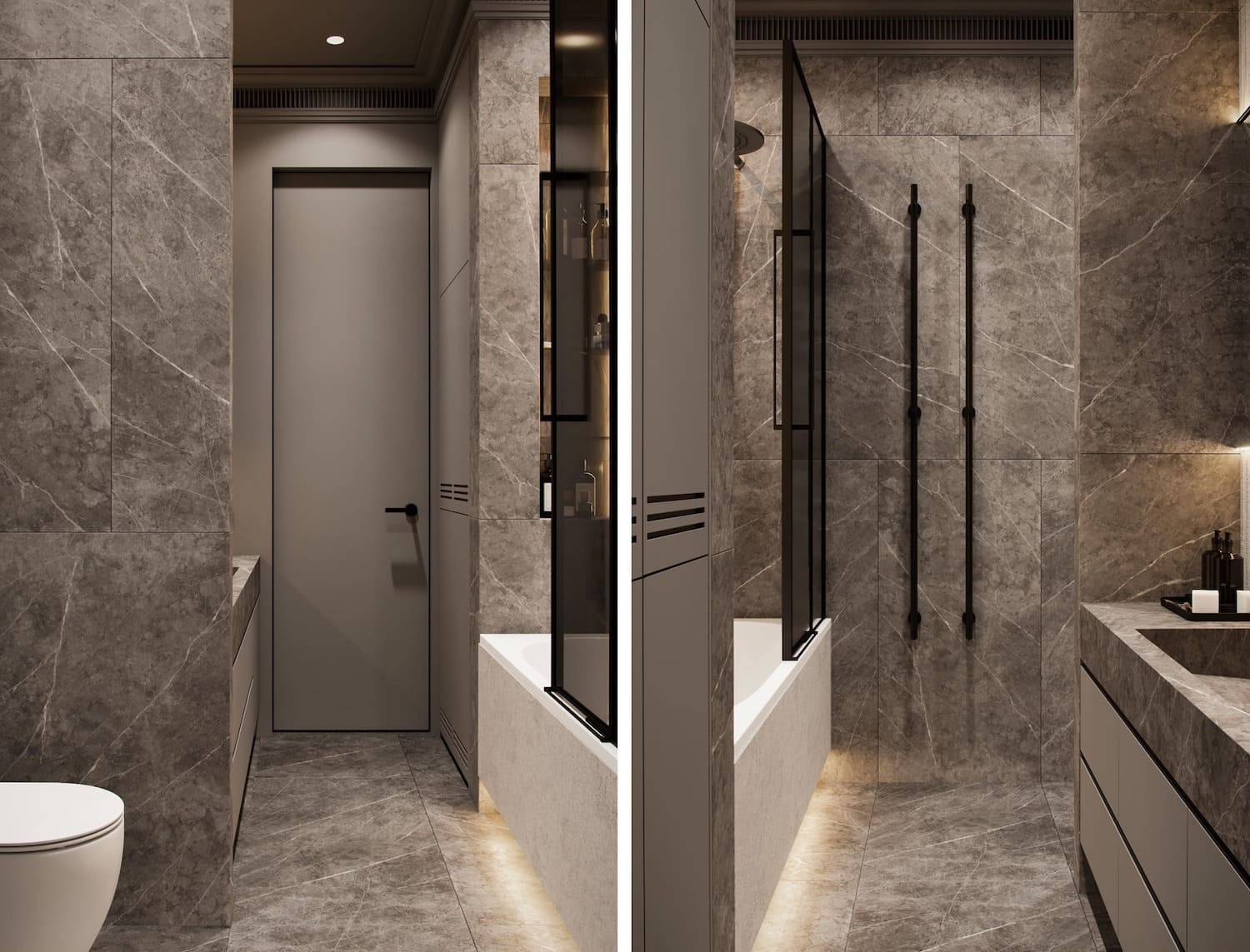Устойчивое к влаге бумажное покрытие – довольно экономный и практичный вариант, который также подойдет для оформления современного дизайна совмещенной ванны с туалетом. Шикарно смотрится и санузел, оформленный с помощью мраморных плит или натурального камня.