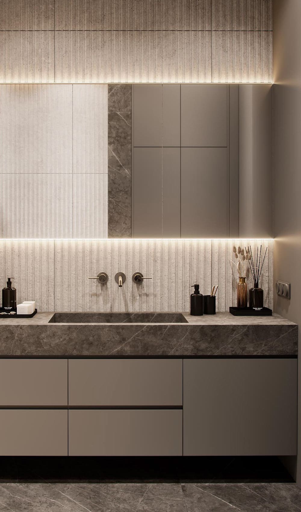 Современная ванная комната любит комфорт и последовательность, поэтому уделите этому особое внимание. Современный – не значит монохромный, но определенно лучше избегать пестрых схем