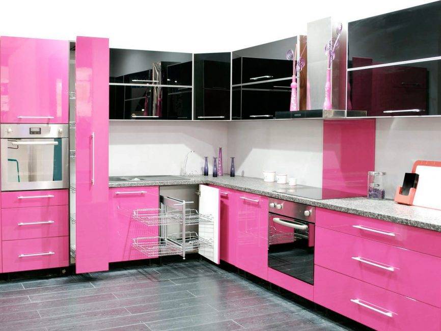 Черно-розовая кухня с продуманной функциональной гарнитурой