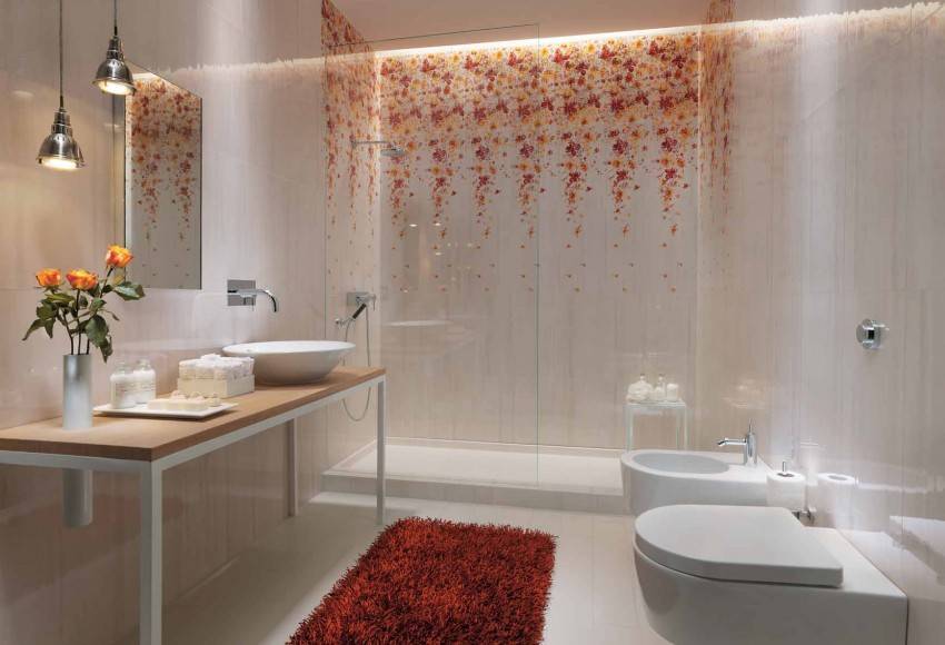 - Использование плитки для стен с небольшим рисунком или фото – пейзаж. Это известный прием, который делает комнату больше.