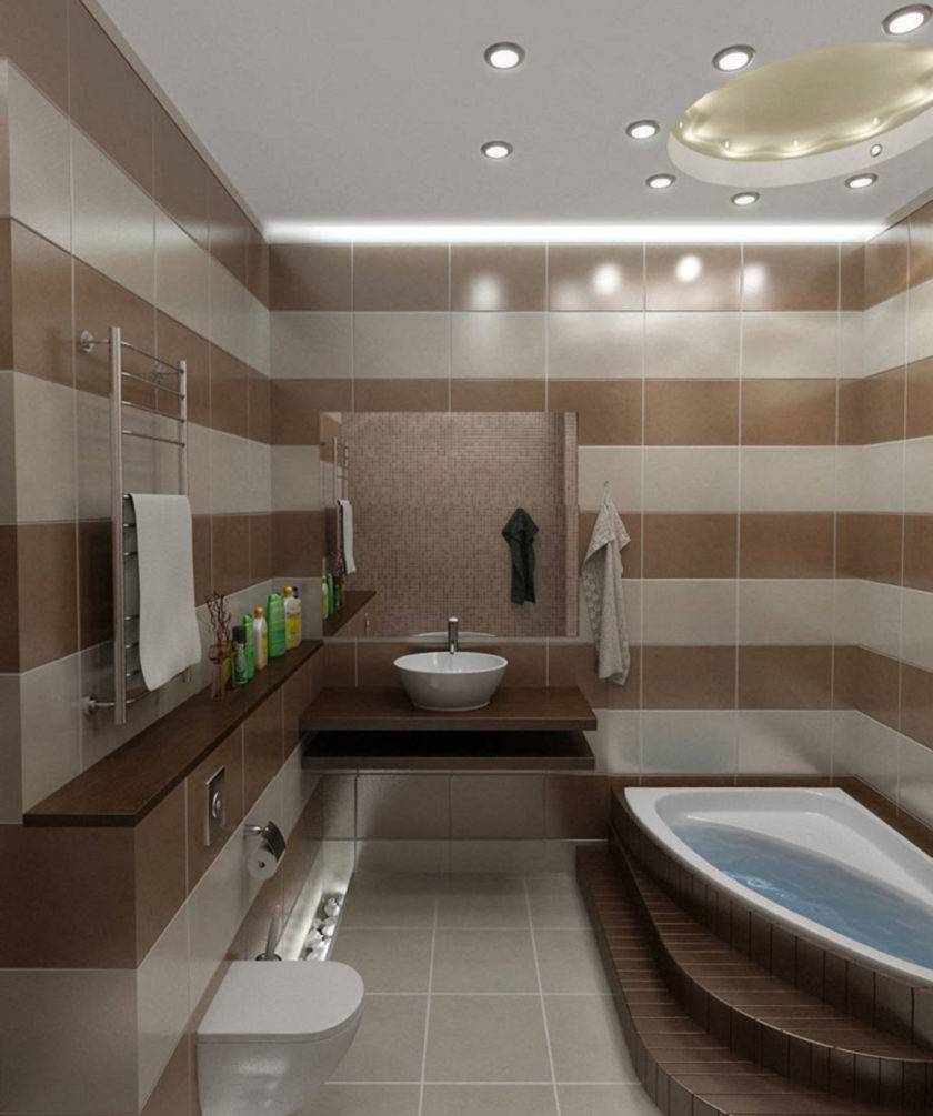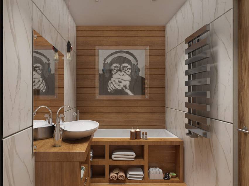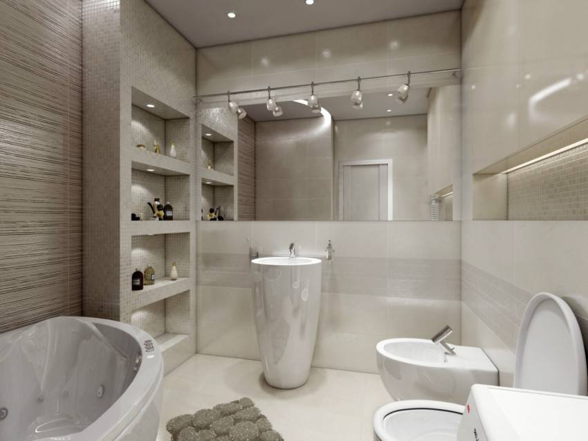 Облицовка керамической плиткой всей комнаты является дорогостоящим занятием, поэтому дизайнеры предлагают проекты, в которых разные материалы для отделки стен комбинируются. К примеру, вокруг ванны укладывается плитка, а все остальное пространство отделывается панелями или штукатуркой, которая устойчива к высокой влажности.