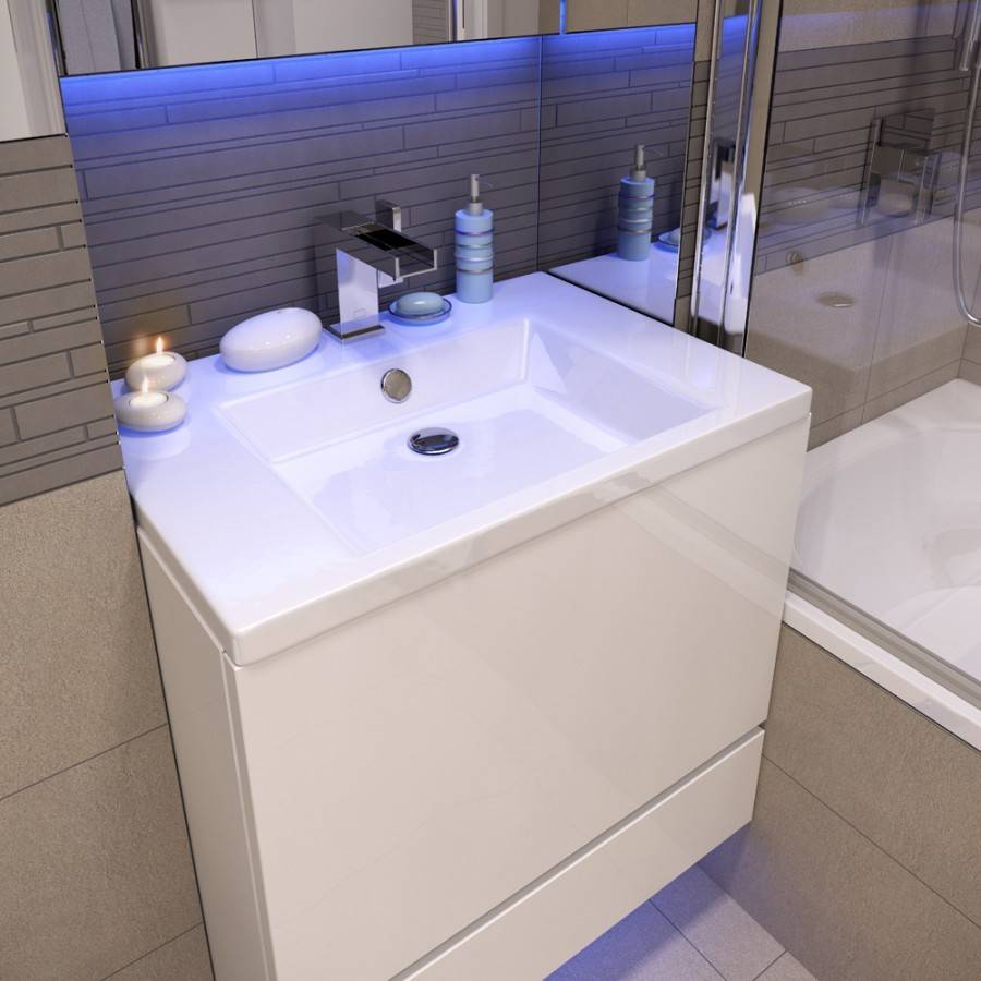 - умывальник утоплен в столешницу; под умывальником расположены закрытые секции для хранения; светильники подвесные, свисают с потолка; зеркало на всю ширину стены;