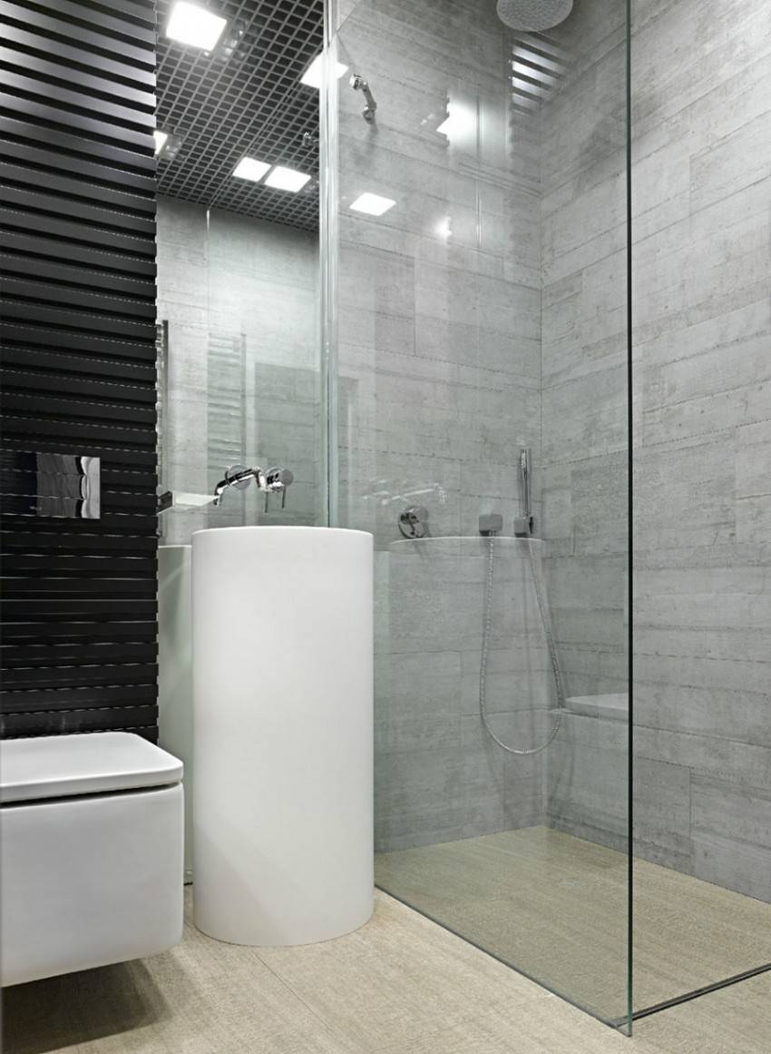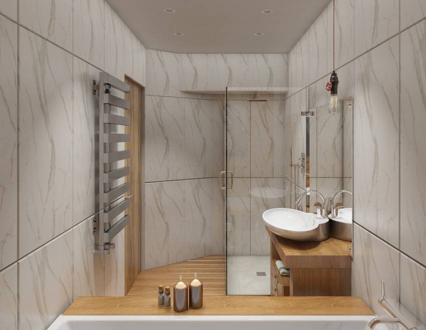 - все коммуникации и подводки зашиты в стены — ничего не напоминает о современных технологиях, кроме смесителей и мягкой подсветки;