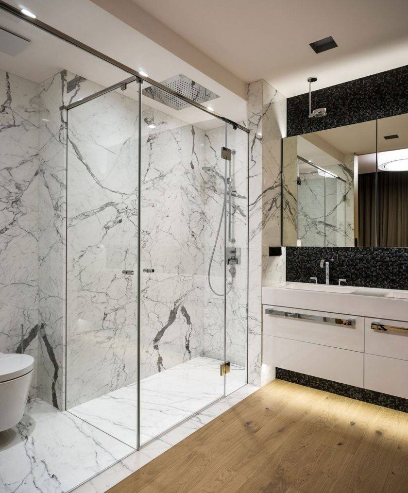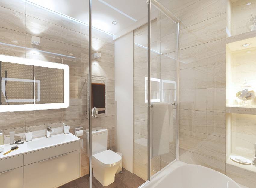 - вместо шторки предусмотрены стеклянные раздвижные дверцы, на потолке — точечные светильники; в боковой стене предусмотрены ниши для хранения полотенец, шампуней и прочих средств по уходу;