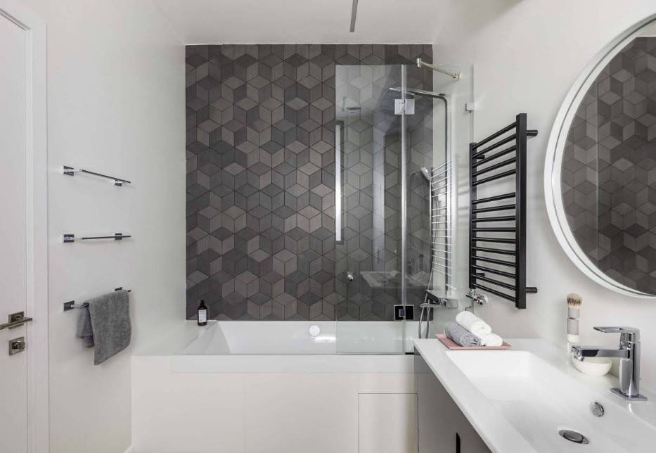 - Одна стена облицована кафелем в 3D дизайне — крупные прямоугольные плитки с рисунком, имитирующим объемные кубические фигуры. Их грани окрашены в цвета, которые используются в отделке комнаты — различные оттенки серого.