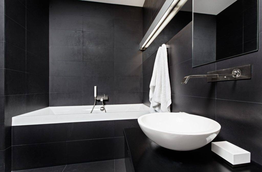Обычно делают черными стены (полностью или до середины) и пол. Либо оформляют таким образом пространство вокруг предметов обстановки ванной. Удачным дополнением становится сантехника, мебель, потолок белого цвета. Шкафы, тумбы, полки могут быть выполнены из дерева.