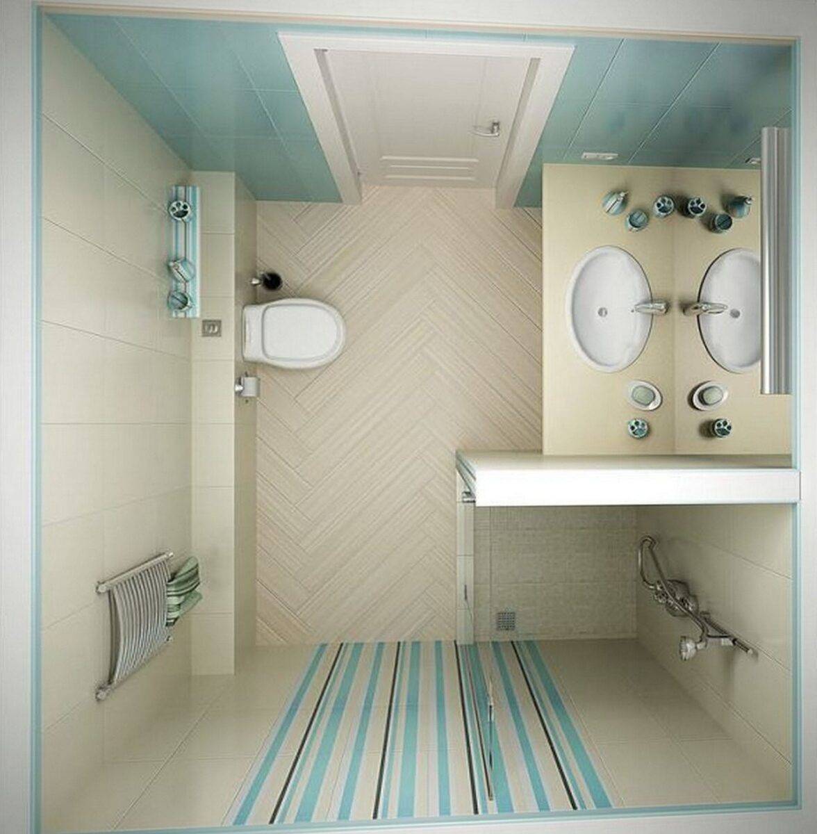 - Узкая раковина напротив санузла экономит пространство компактной комнаты.