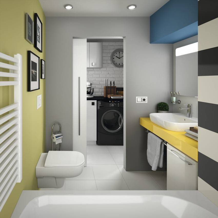 Если в этой комнате необходимо разместить умывальник и стиральную машину, то для компактности машинку можно установить под умывальником. Унитаз для узкого санузла можно разместить в углу, либо выбрать подвесную модель.