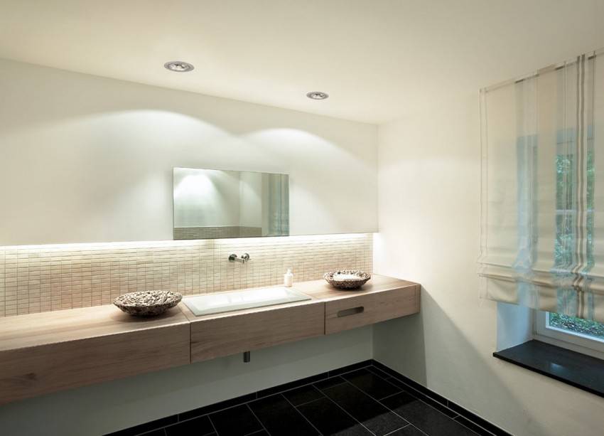 Желательно не отказываться от точечных потолочных светильников – они помогут добавить санузлу светлости, что визуально сделает его больше.