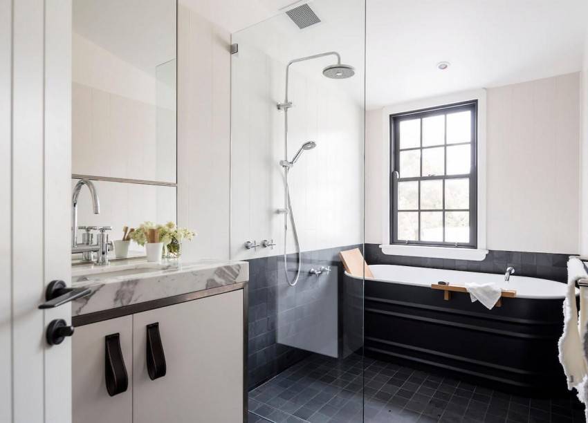 Стекло устойчиво к влаге и другим повреждениям, что особенно важно для конструкций в ванной комнате. Черная мебель из дерева — это более классическое решение. Некоторые могут утверждать, что деревянные конструкции будут быстро разрушены, но это не так