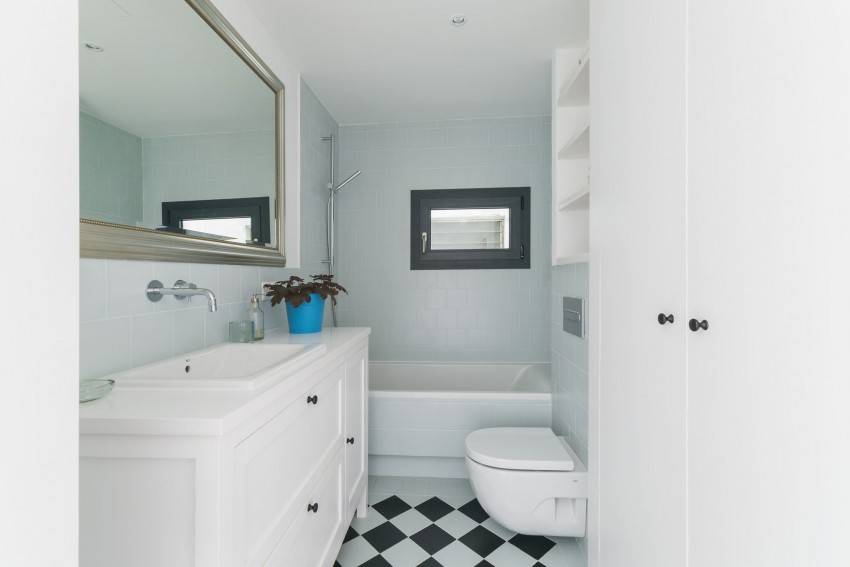 Классические скандинавские интерьеры используют много контрастов и геометрии – то, что нужно для узкой комнаты. Черные орнаменты и цветные постеры на белых стенах визуально расширяют комнату. Сильный прием – контрастные «шахматы» из плитки, которые переходят с пола на стены и наоборот. А за домашний уют отвечают приятные мелочи: красивые баночки и диспенсеры, свечи и мыло ручной работы, яркие пушистые полотенца и коврик под ногами.