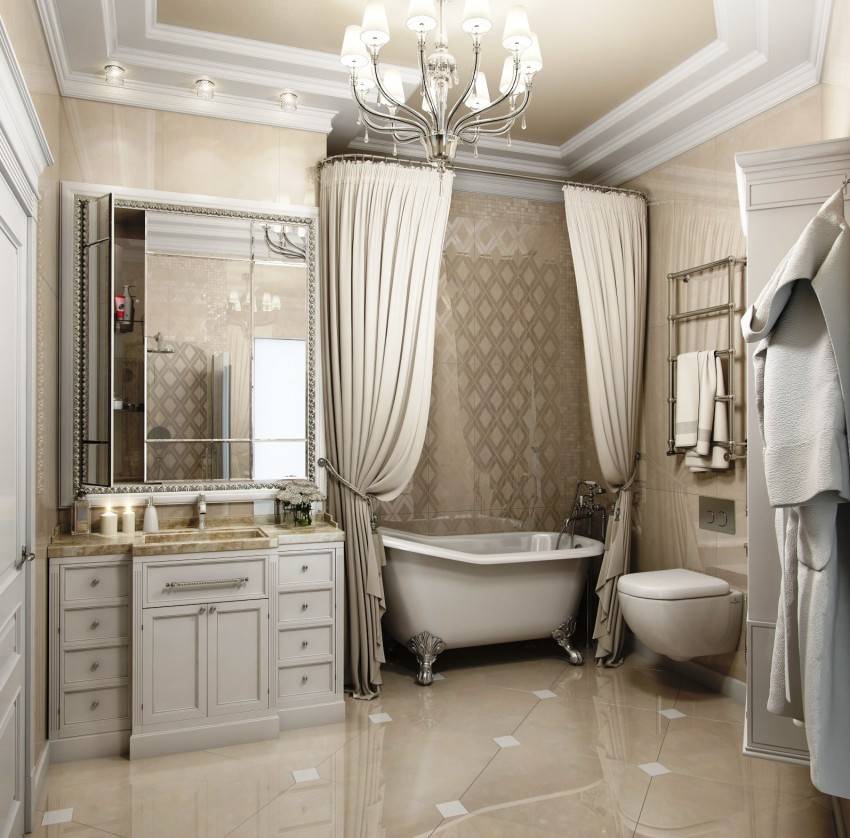 Даже монументальную и пышную классику можно подкорректировать под узкую ванную, оставив только основные черты. Бери простые формы, а акцент смести на дорогие материалы – камень, ценное дерево, позолоту, состаренный металл. Лепные и резные узоры – хороший способ добавить горизонталей. Используй симметричную расстановку, но смести центр из середины комнаты к середине широкой стены.