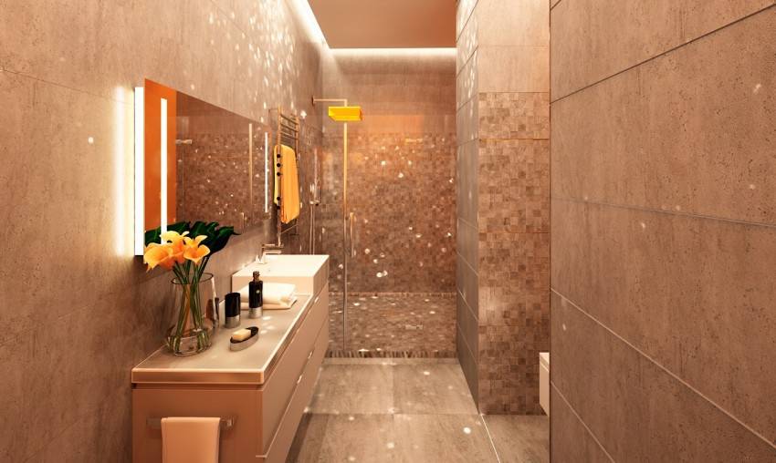 Исходя из этого, специалисты по дизайну интерьера дают такие советы по оформлению длинной узкой ванной комнаты, как: