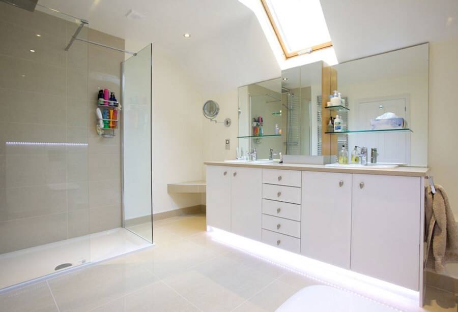 Потолок — лучшее место для настоящих или декоративных балок, с видимыми погрешностями в отделке. Основной цвет его фона в условиях небольшой ванной должен быть светлым. Для более просторных помещений — любой. Но в рамках стилевых требований.